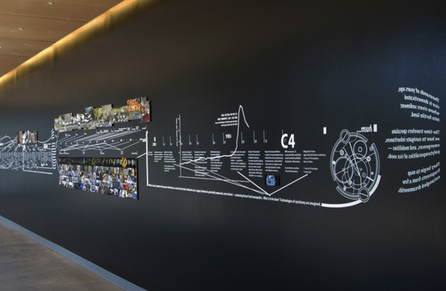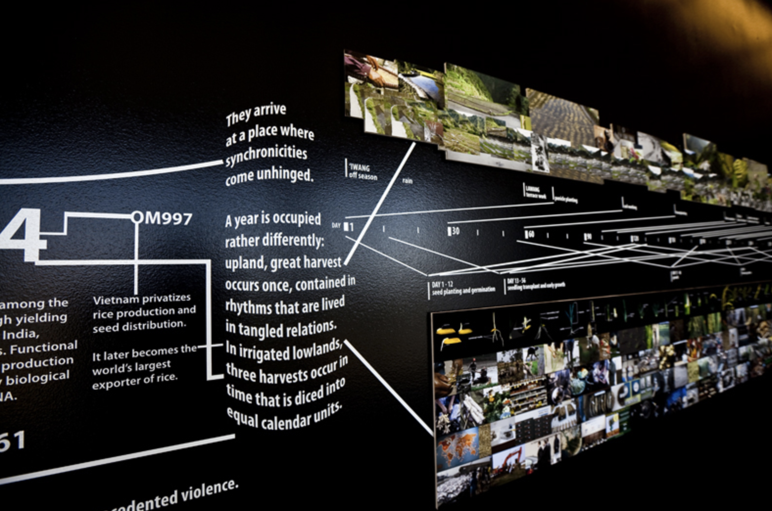 Elaine Gan, an American artist, explores the development of rice in her work titled Rice Child (Stirrings). She shows visitors this history by displaying four different timelines on a gallery wall. The first timeline begins at Year Zero in the Mekong delta, where champa rice shaped early states. It then spans colonial occupations, the Green Revolution, biotech advancements, and the 2008 food crisis. The heart of the installation is a calendar year, revealing links and between rice practices in the Ifugao Rice Terraces and global plantation agriculture. Gan’s research draws from ethnography, history, and science, with fieldwork spanning rice science institutes, genetics labs, and natural landscapes across the Pacific Rim.