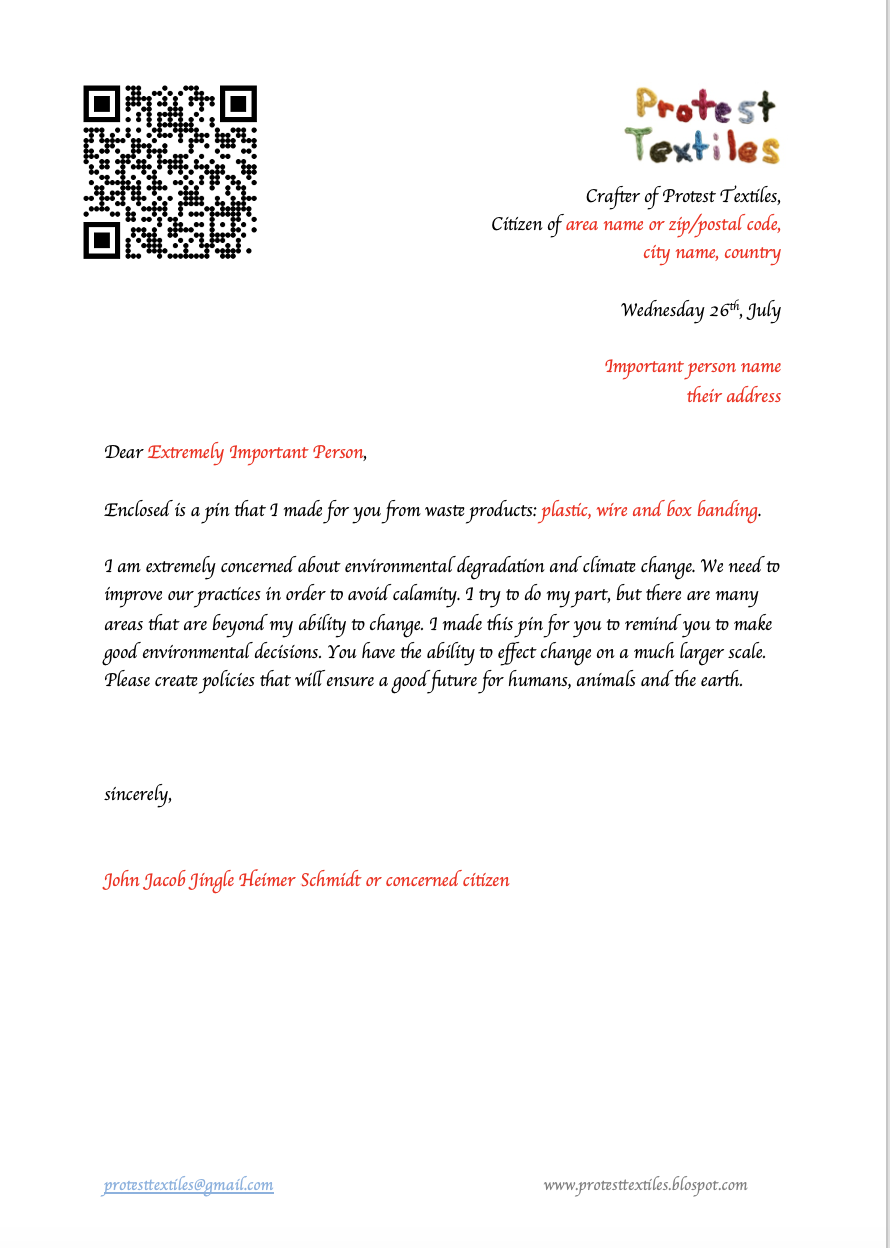 My project Protest Pin Workshops uses workshops as a method to increase inclusion and widen access to art activism and protest textiles. While Han Sifuentes’ project might be seen as shadow protest (insert reference to my chapter on shadow protests), the art activist and craftivist workshops mentioned previously are not active protests, but training or protest item creation for protest. My project envisions the workshop as a place of active protest. Participants craft a textile pin or accessory within the workshop that is then gifted, mostly through mail, to a public figure to encourage them to make good choices to mitigate the climate catastrophe.
