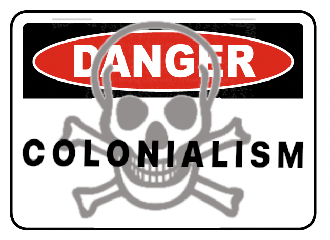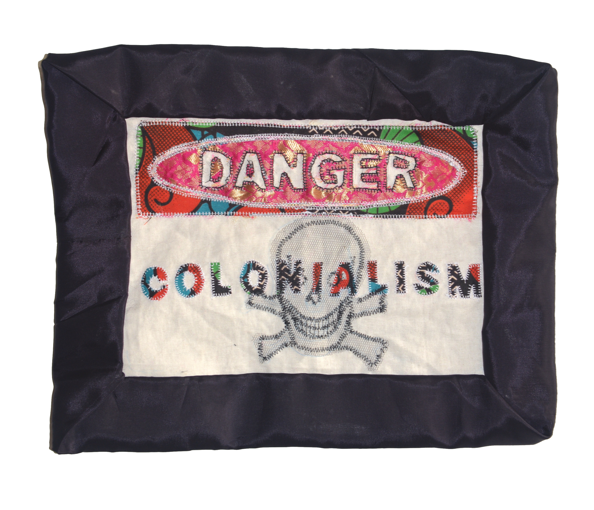 I created two textiles around the war in Gaza and used caution signs and the poison skull and bones as symbolism. I also choose to use the word colonization as I view it as the root cause in the conflict. This danger sign was picked, both because it conveyed the message and because it allowed me to use fabrics with meaning to further the message. I wanted to work with dutch wax print and Indian cloth because both have a surface level tie to colonialism, but both also have very interesting deeper histories regarding colonization, slave trade and industrialization. To create my image, I found a danger sign and a skull and cross bones from the internet and put them together. I also used the word colonization, which in this application is an overly long word, but there is no sufficient replacement for it. The first image I made, on the left, looks great on paper, but does not account for the ability of textiles. The next two used the possibility of working with a sheer material in order to create the poison skull and bones. This would allow for the word colonization to be a more appropriate size compared to the word danger. I chose the smaller skull because the removal appliqué process, the stitching and the print fabric was likely to be more distracting than the word colonization that was sewn on top of the blank background. In real life, the skull and bones and the word colonization are more distinct then they appear in the photo.