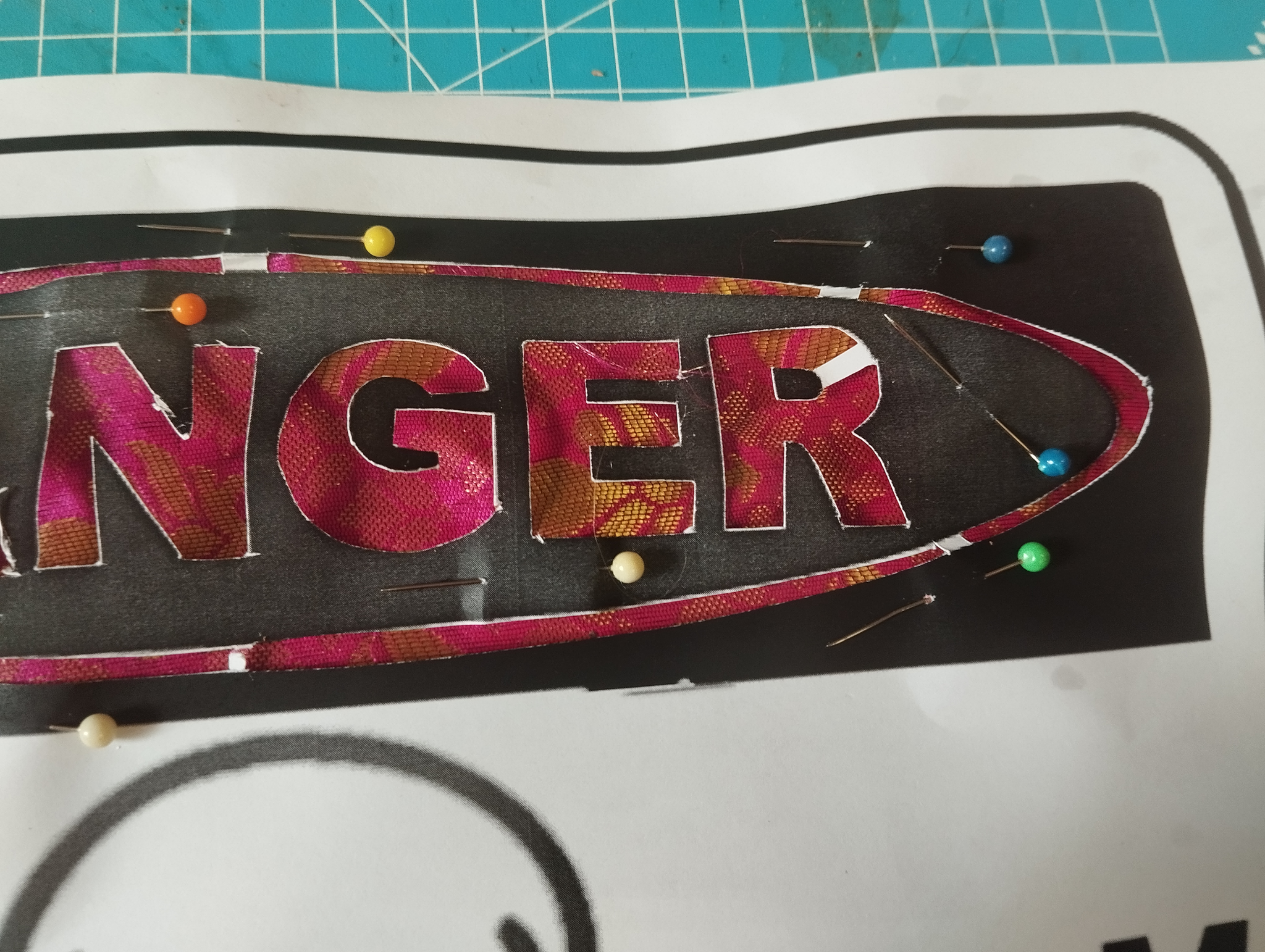 I used a printed version of my template to sew directly onto. The removal of the oval around the word danger proved challenging and was perhaps more effective as a design element in the printed version than the textile. I finished the piece by adding a wide border with a shiny black-purple material from my studio stash. The border made the piece a bit larger and gave it a quilt or blanket quality. A regular thin border would have been more like a patch or a frame and less of a blanket quality. I considered quilting the piece, but decided it would not add to the work and might be distracting to my imagery. I also choose to use a machine rather than work by hand as it would take a few days rather than a few weeks to create--some people are super speedy hand embroiderers, but I am not one of them.