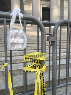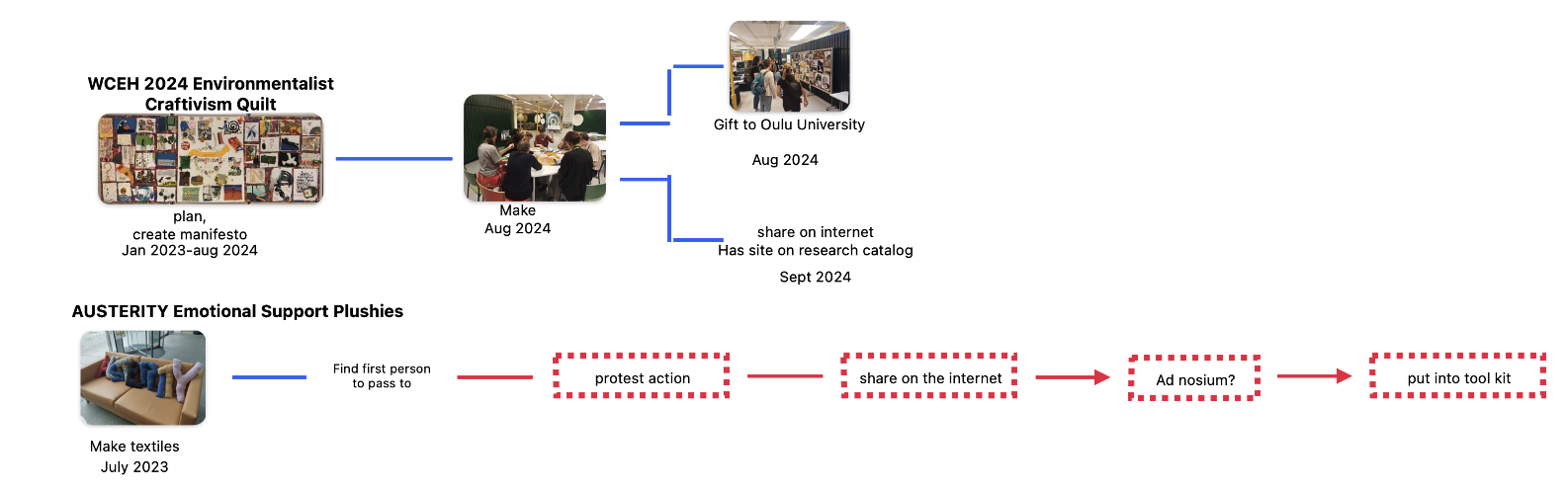 Art activism is powerful. Also known as activist art, protest art, visual activism, artivism and creative activism, it changes lives, situations and is and has been a powerful weapon across a whole spectrum of struggles for justice. Teresa Sanz & Beatriz Rodriguez-Labajos(2021) relay that art activism has the unique ability to bring cohesion and diverse peoples together and it can, as Zeynep Tufekci notes, change the participants (2017). As Steve Duncombe & Steve Lambert (2021) posit, traditional protesting such as marches or squats are no longer as important as they once were. As a result of my own lived experience in activist activities, I very much agree with Andrew Boyd & Dave Oswald Mitchell (2012) that the reason people use art activism is that it works, by enriching and improving protest. In the past, when I lived in a metropolis and was not a parent, I used to be an activist. Now I no longer have immediate access to international headquarters at which to protest and I have to be concerned with being arrested, I am hindered from protesting. This project is an attempt to increase inclusion and widen access to art activism. By devising methods which include at least one of the following: that do not require on-site participation, that can take place outside the public gaze, that reduce the risk of arrest, that open up protest sites that are not “big targets”, that include remote locations, that involve irregular timing, my thesis aims to increase inclusion and widen access to art activism to those who are underserved by more mainstream methods of conducting art activism. Textiles have unique properties that enable them to engage in subterfuge and speak loudly through care and thought(Bryan-Wilson, 2017). They have strong connotations of domesticity, the body and comfort that can be subverted within art activism to reference lack of this domestic warmth and protection(O’Neill, 2022). Being a slow form of art-making, they show care and thought, attention in the making, so that the messaging is reinforced through this intentionality in slow making.