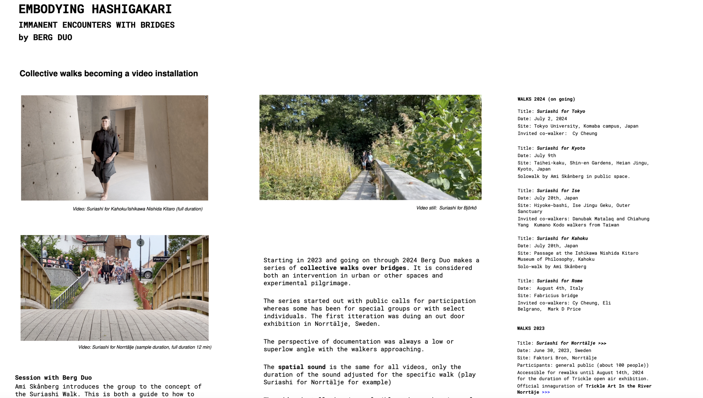 The suriashi project over briges has been turned in to a growing video installation link to exposition for Embodying Hashigkari - immanent Encounters with Briges