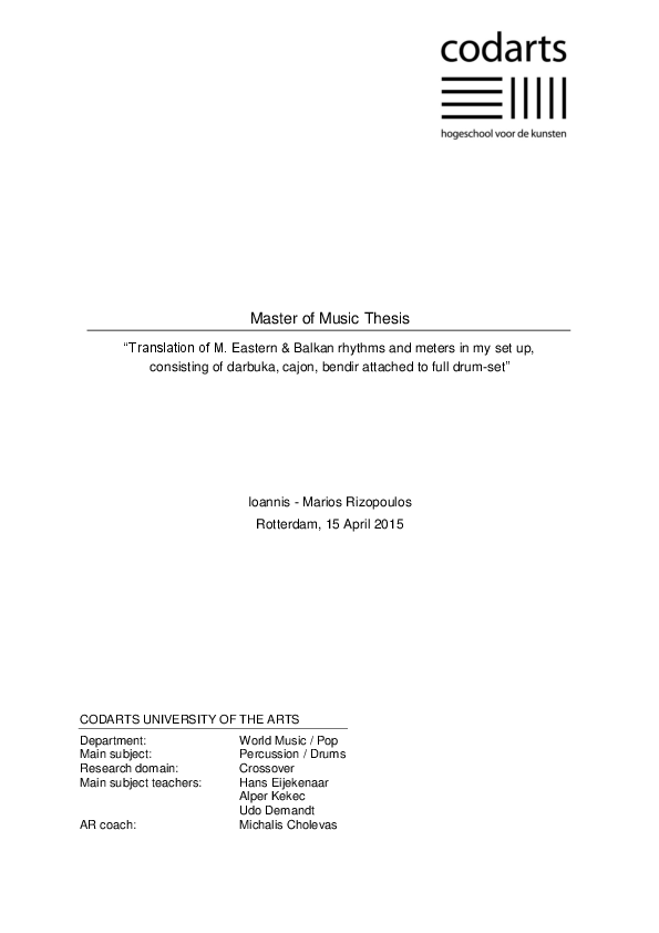 • Ioannis Rizopoulos - Translation of Middle Eastern & Balkan rhythms and meters in my set up, consisting of darbuka, cajon, bendir attached to full drum-set - 2016