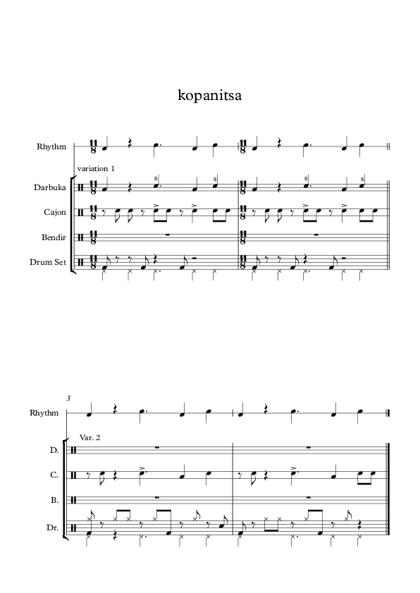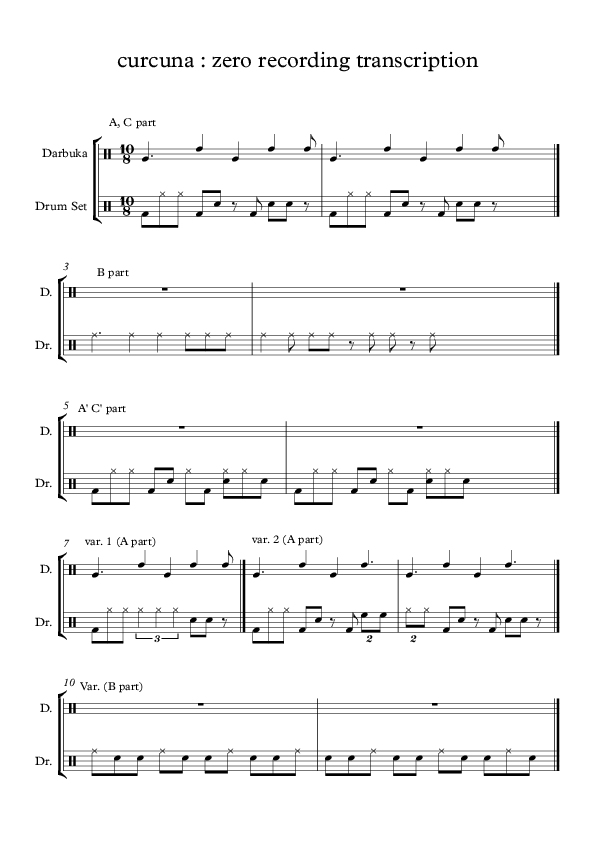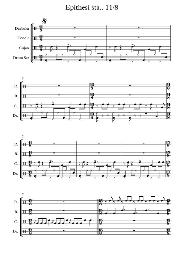 This paper focuses on the structure of a practical method that facilitates the transition from traditional elements towards the modern expression of performing on percussion. The primal aim behind this idea is to enrich the performer’s experience by, not only exercising on odd meters and rhythms seen in traditional music of the Middle East and the Balkans, but also using a variety of instruments on the same time for getting the required acoustic outcome. On the other hand the main instrument on which the full combination of the percussion-set was based, the drum-set, is giving the perfect match on a try-out to combine different music practices of the East and the West. Conducting a study like that sets the start for experimentation on combinations of music styles and their representative instruments. The scope and significance of this research is described in the first section, highlighting the importance of the research question under examination in its final phase. In addition possible ways and primal findings that helped on finalizing the build up of a distinct set-up are commented. Technical matters leading to the desired musical outcome are outlined in the second section, along with the important aspects discovered during the implementation of the study. Results, findings and limitations of the study are described below. The next section, which forms the bulk of the paper, turns to the description of the data under examination, structured into the 3 intervention cycles of research. Sections 4, 5 and 6 all discuss in more detail the technical, notative procedure used and how it was transformed, during the research period, in order to strengthen the significance and application of the approach under examination; basically how to transfer Middle Eastern and Balkan rhythms and meters on a set up that consists of M. Eastern percussion and the drum set. The paper ends with a brief conclusion and the more detailed description of the resulted methodology.