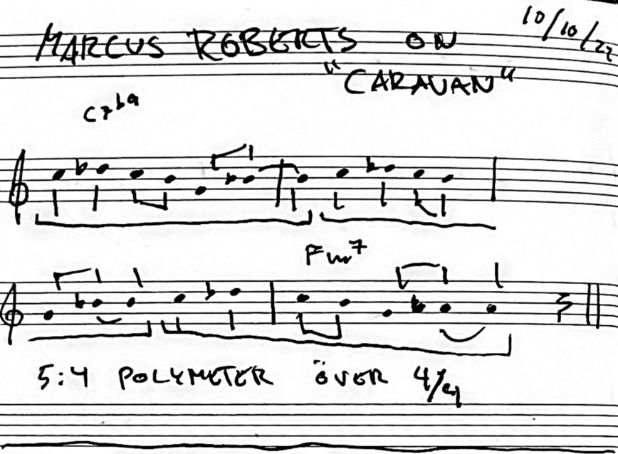 • This short example is Marcus Roberts using gorupings to play over the barline. in this case he groups quarter notes in a five grouping.