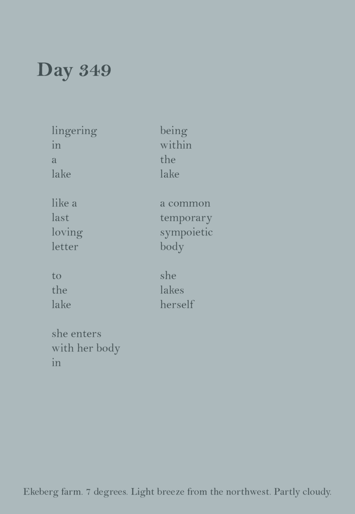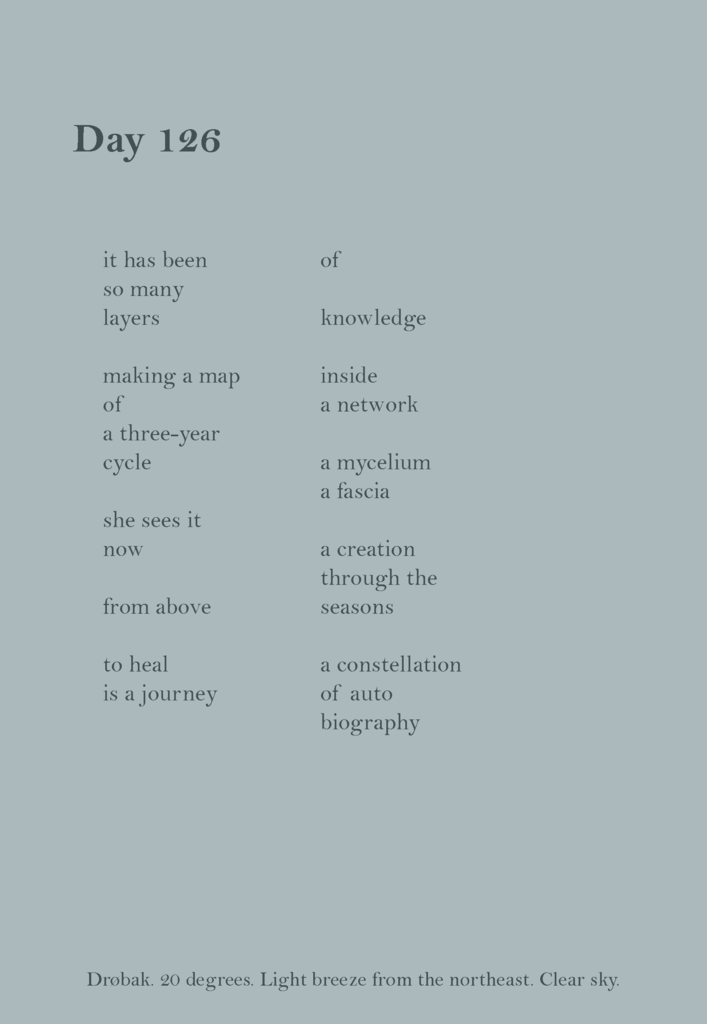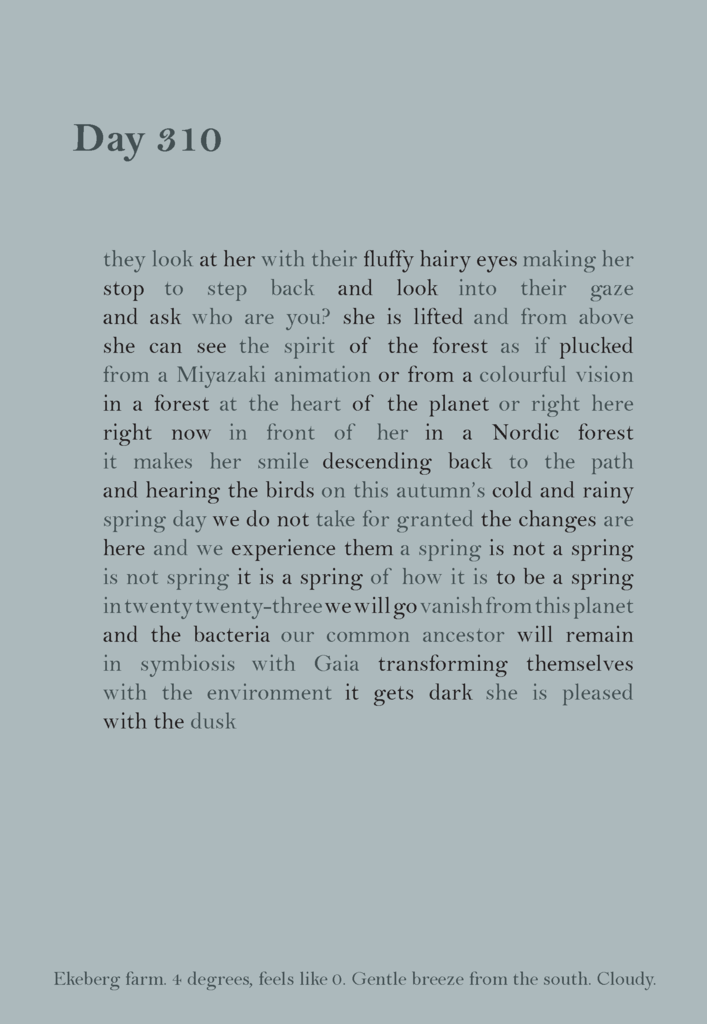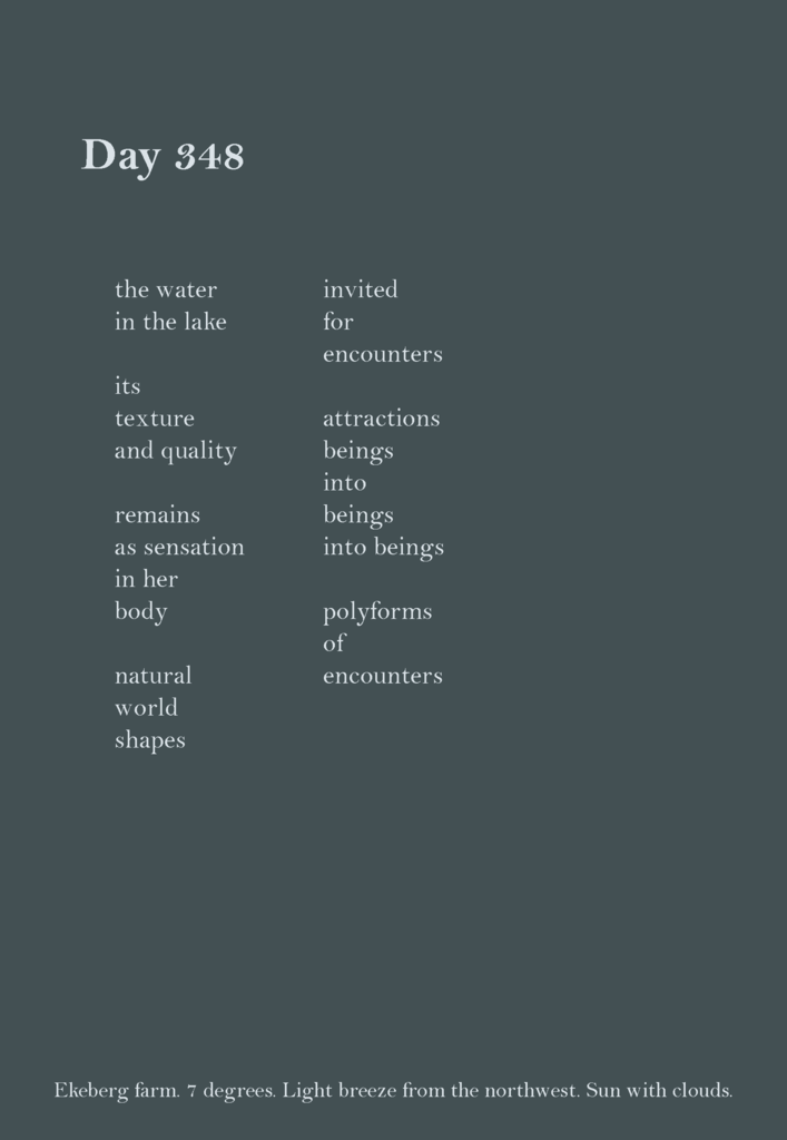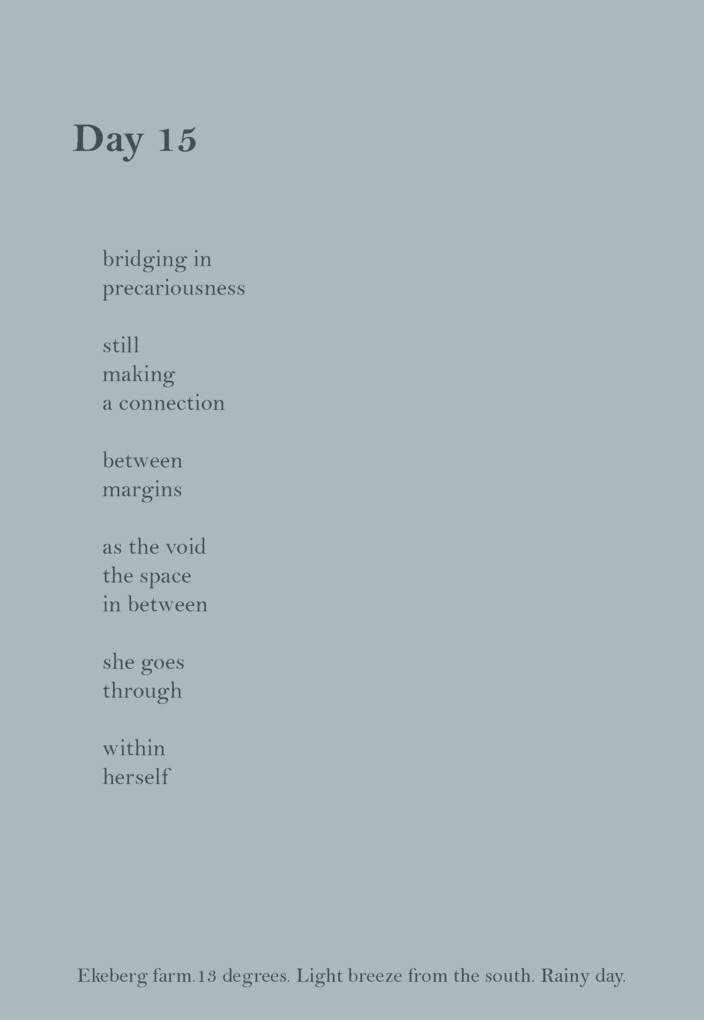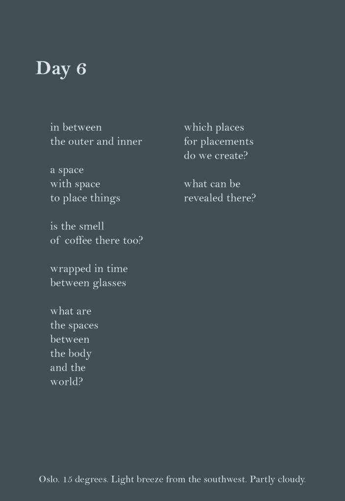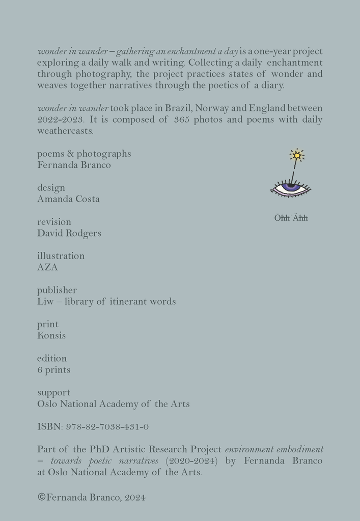 This exposition presents the PhD Artistic Research project environment embodiment - towards poetic narratives by Fernanda Branco at the Oslo National Academy of the Arts (2020-2024). This artistic research explores experiential agency in encounters between body and environment. It draws from uncanny, embodied, and poetic perspectives and unfolds as a constellation of sympoietic practices. PhD Supervisors: Rebecca Hilton - Stockholm University of the Arts (2021-2024) Gunhild Mathea Olaussen - KHiO (2021-2022) Dora Garcia - KHiO (2023-2024) Fernanda Branco has designed this exposition in collaboration with web designer Ellen Palmeira. Illustrations by Aza Drawings by Francisco Blixt Cards and booklets designed by Amanda Costa