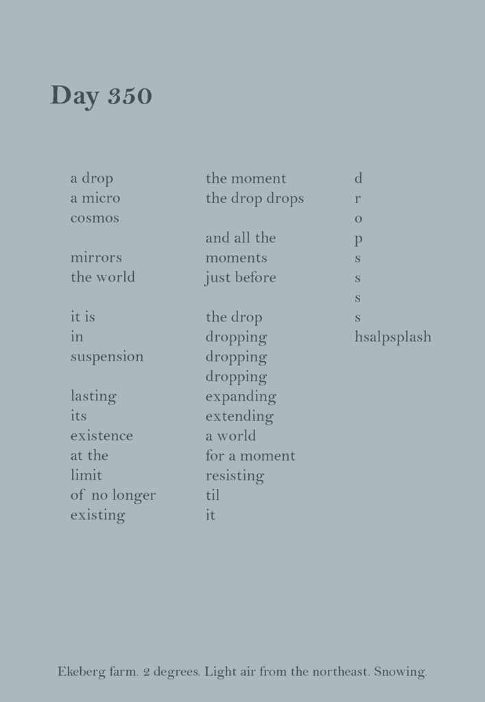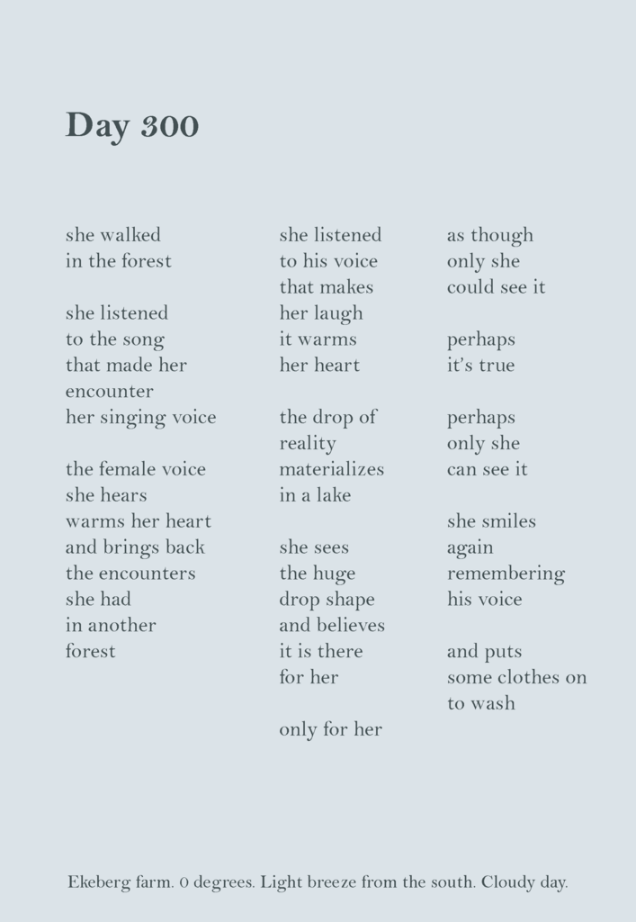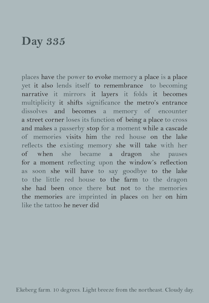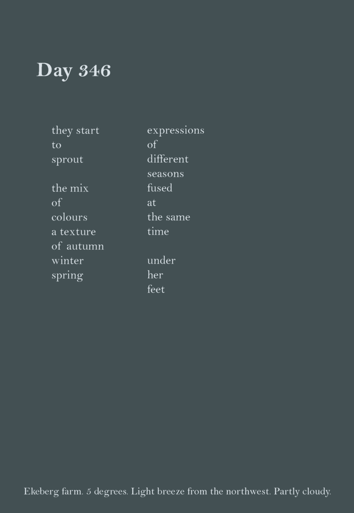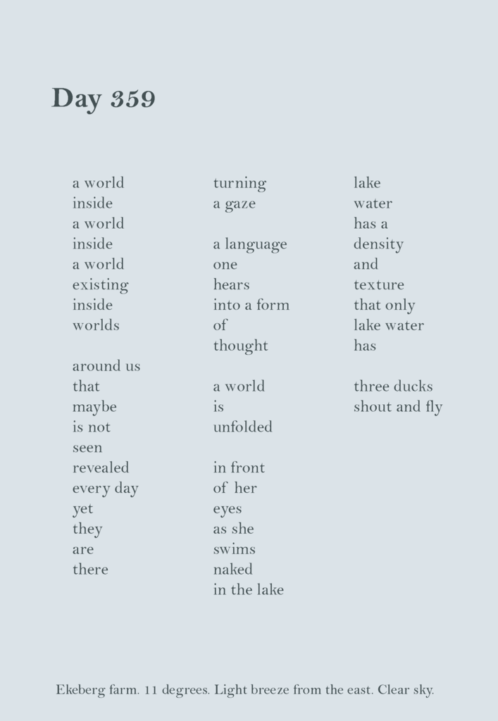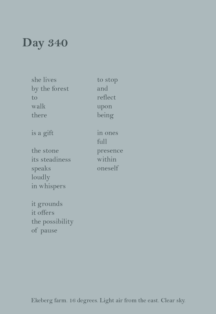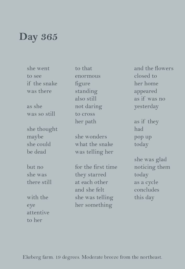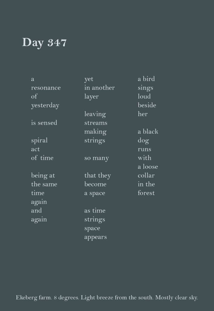 is a compilation of 365 cards documenting one year of daily practice, consisting of a walk, a poem, and a weather registration.