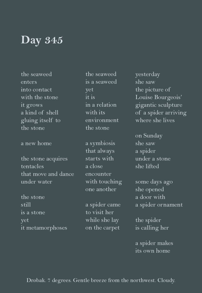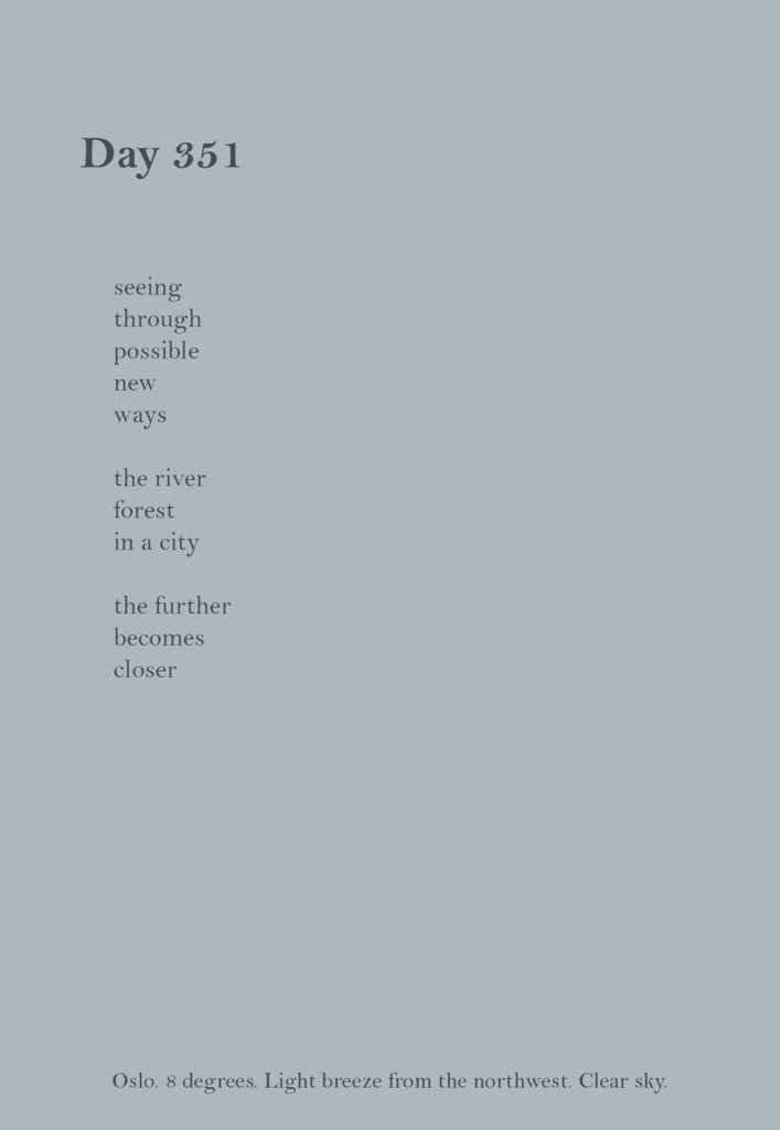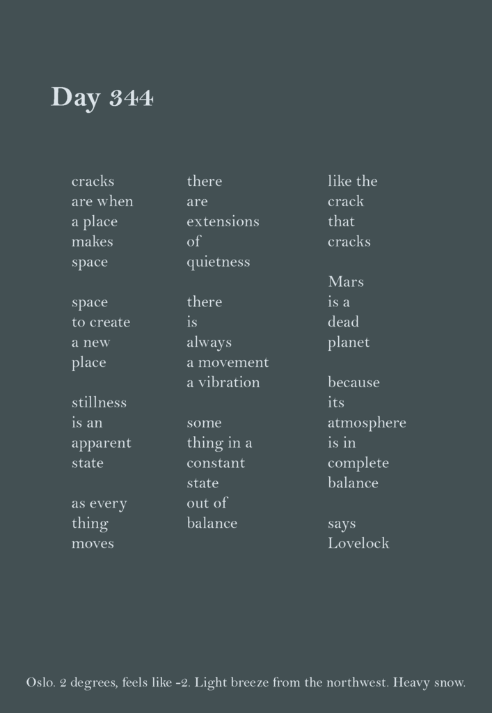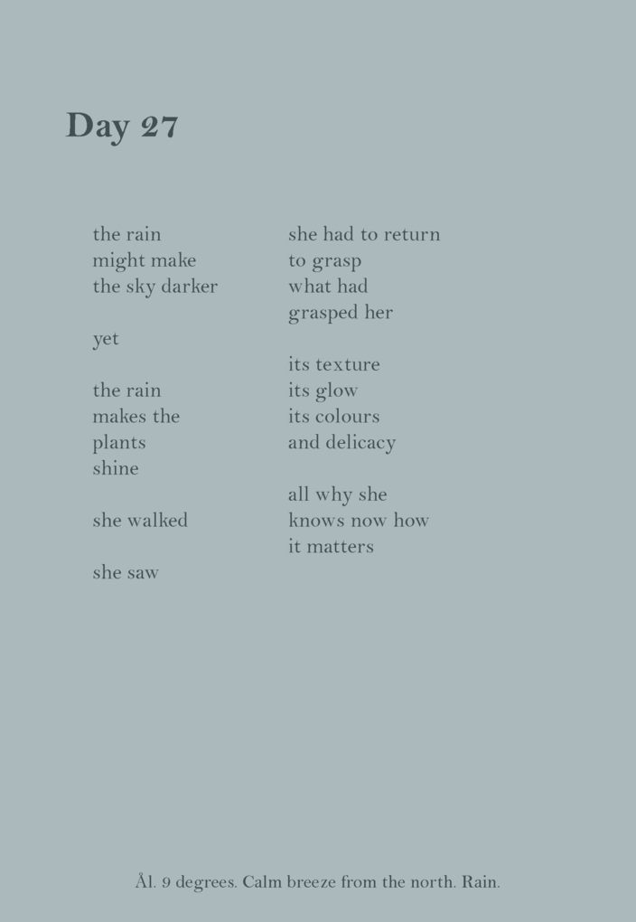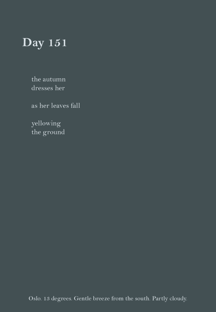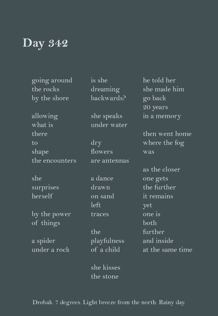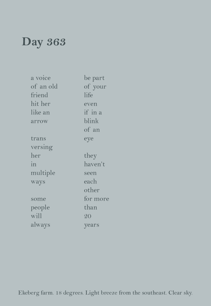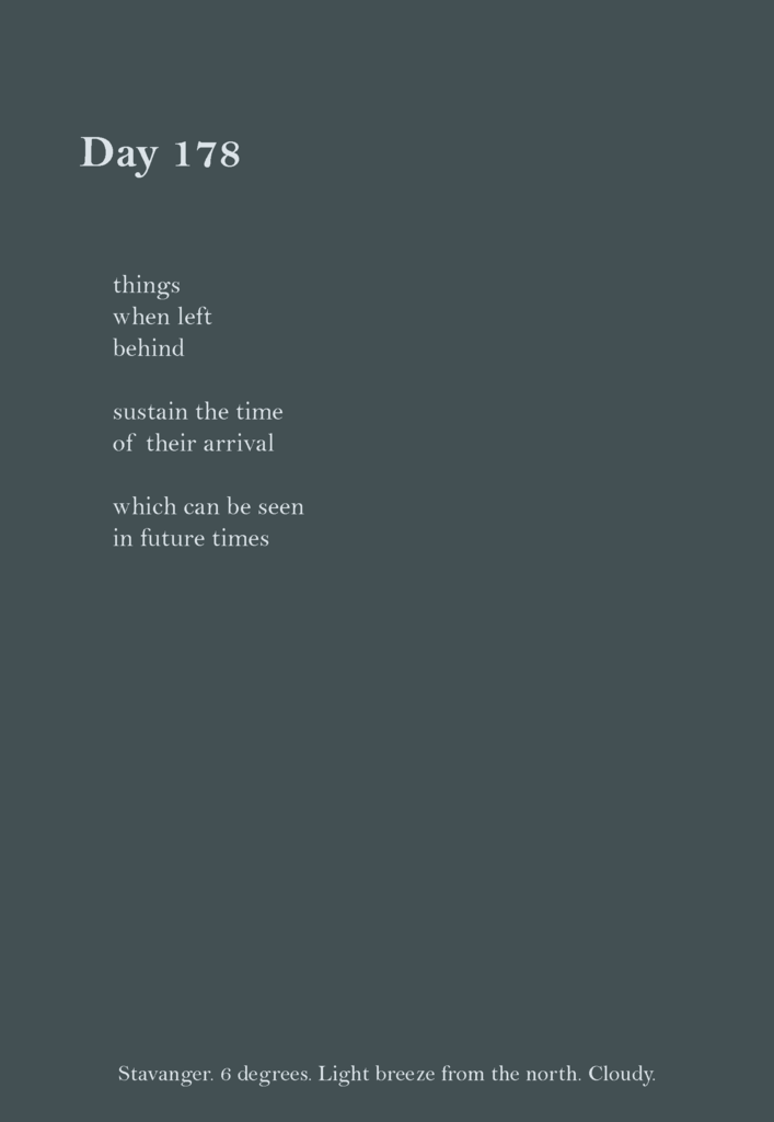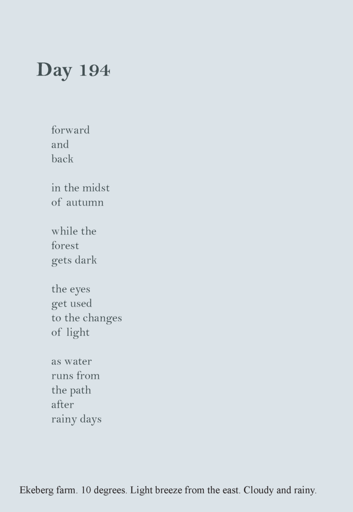 is a compilation of 365 cards documenting one year of daily practice, consisting of a walk, a poem, and a weather registration.