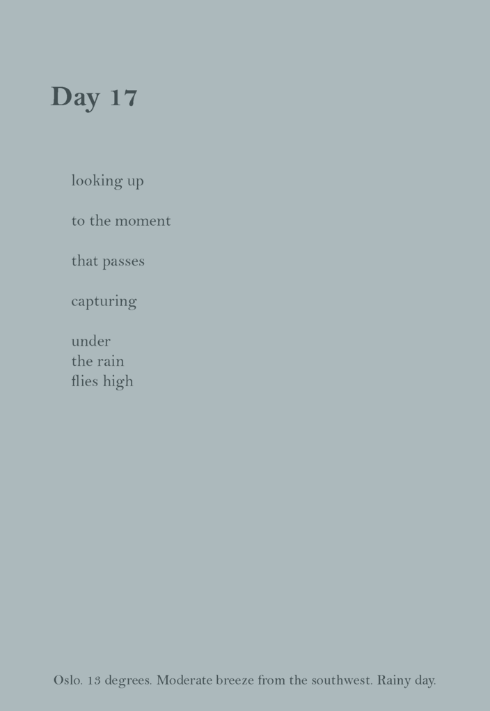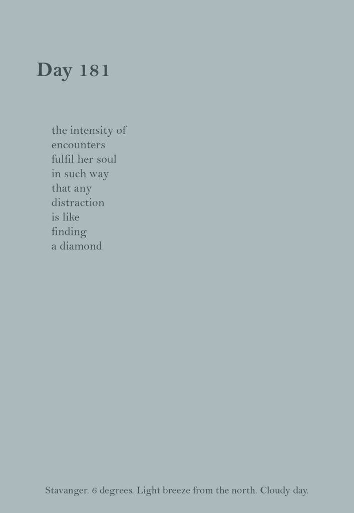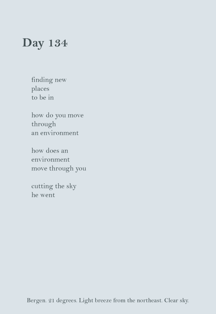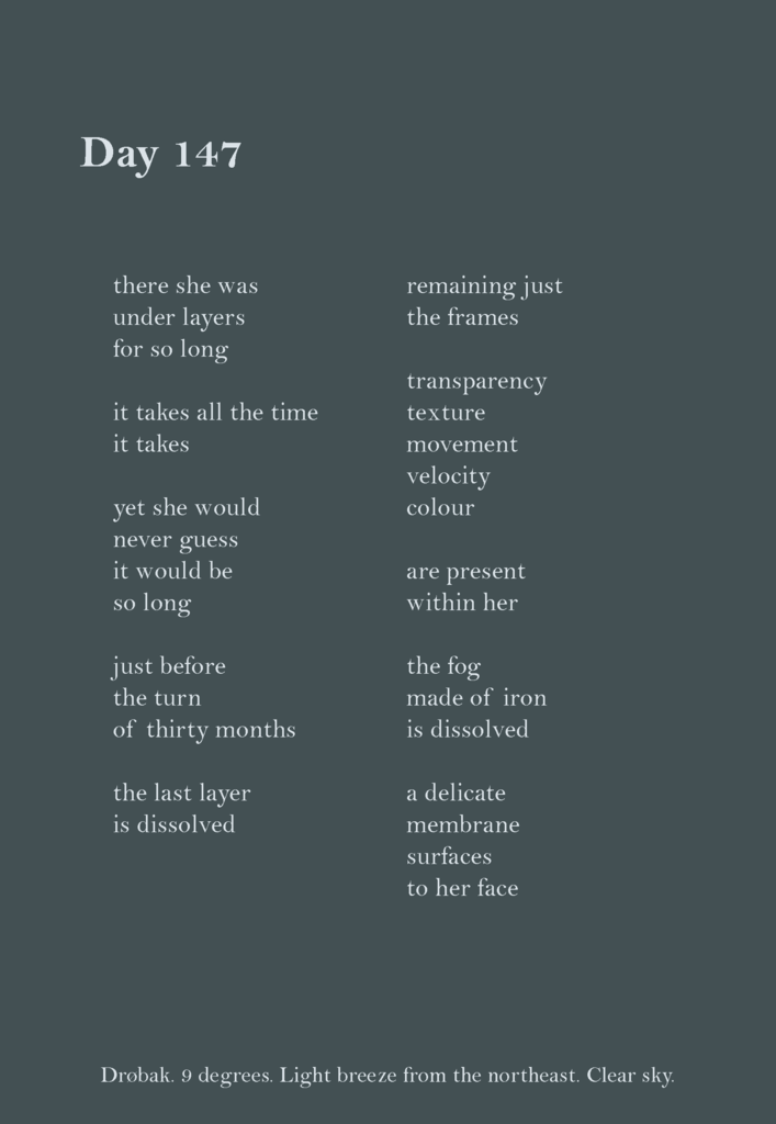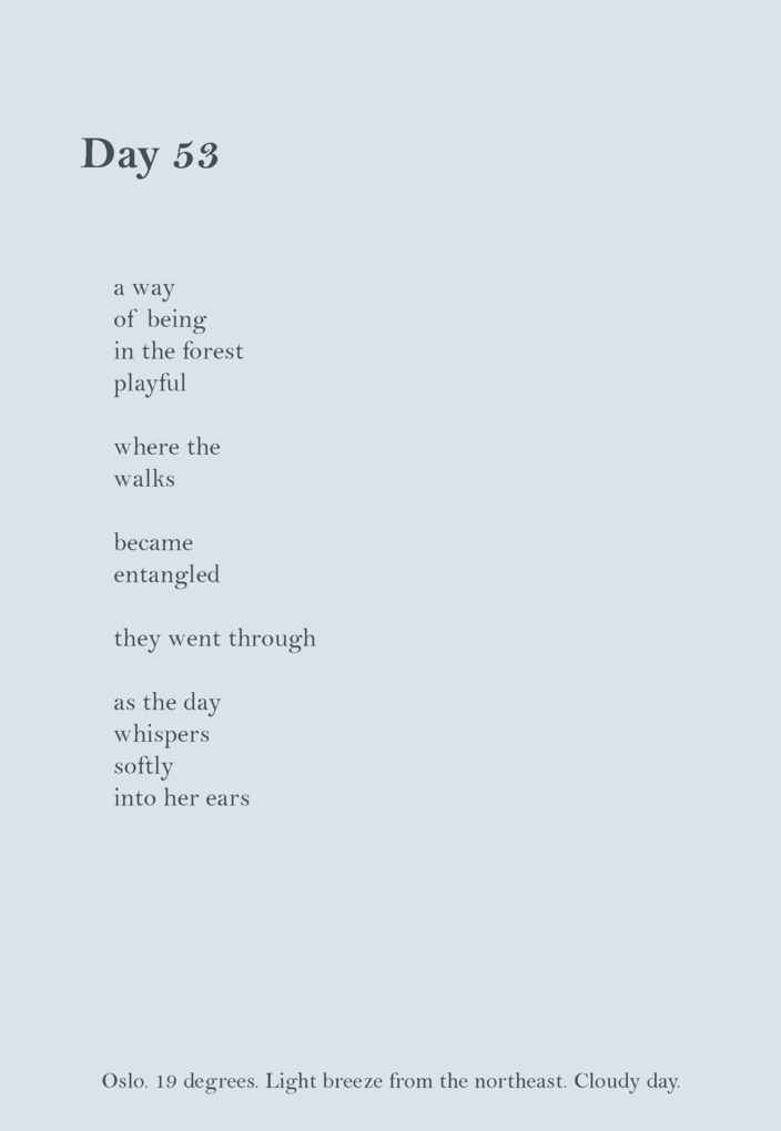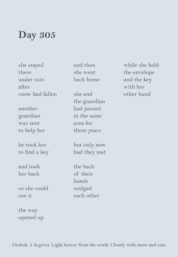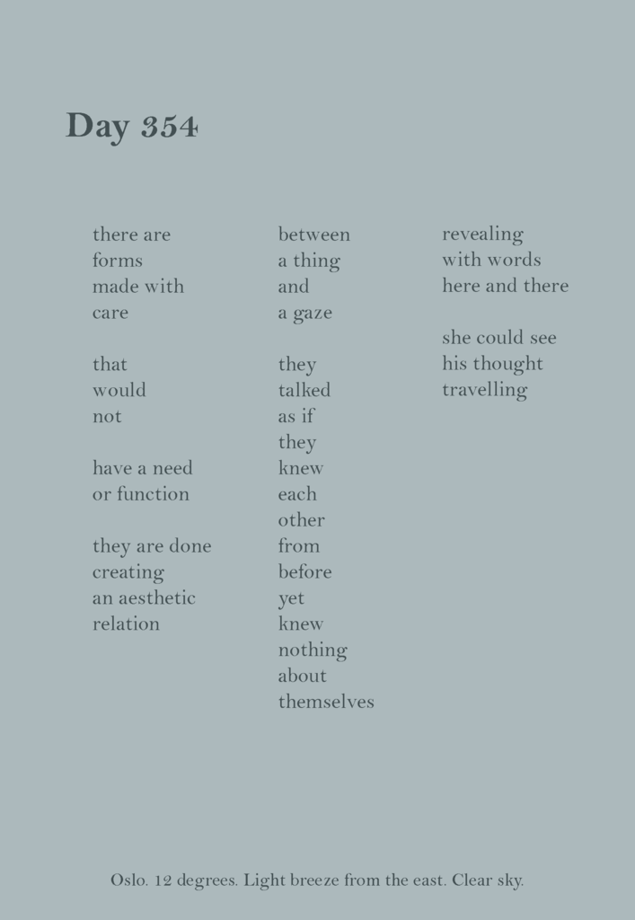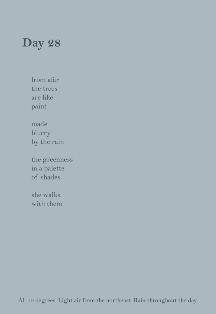 is a compilation of 365 cards documenting one year of daily practice, consisting of a walk, a poem, and a weather registration.