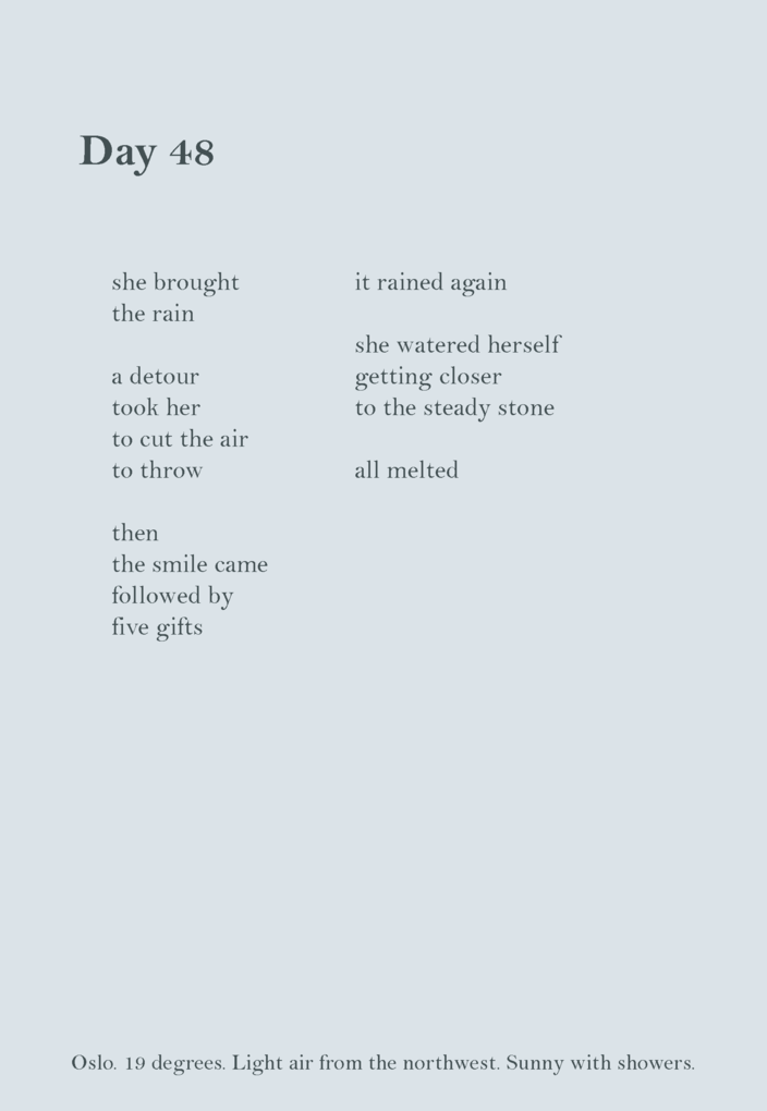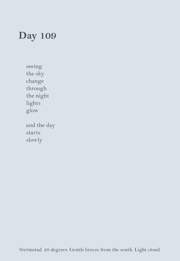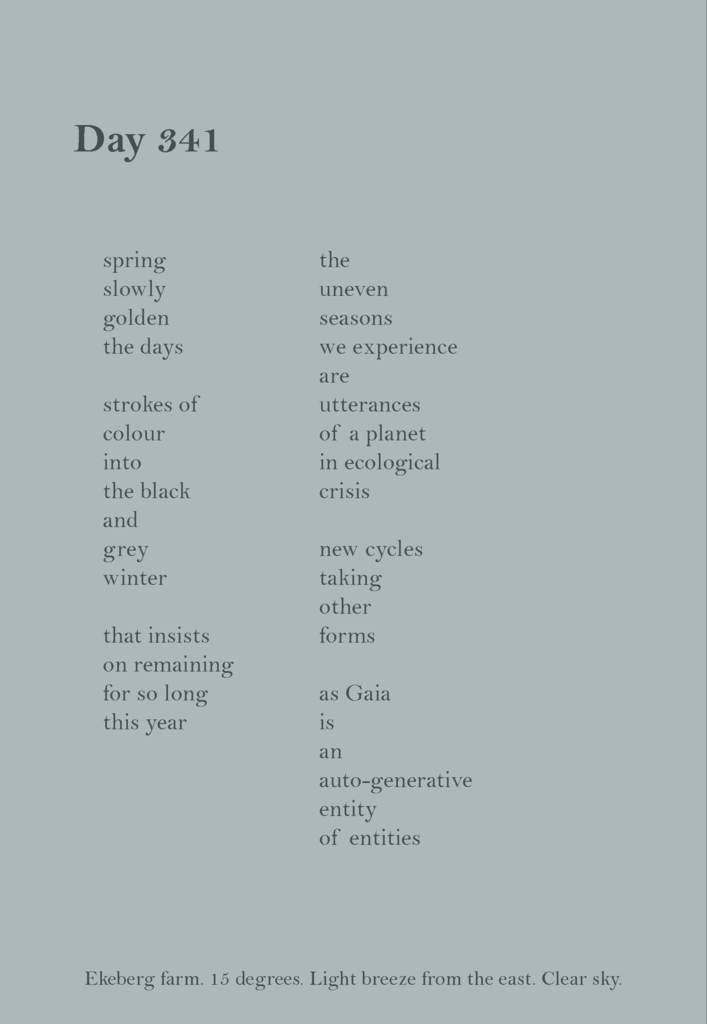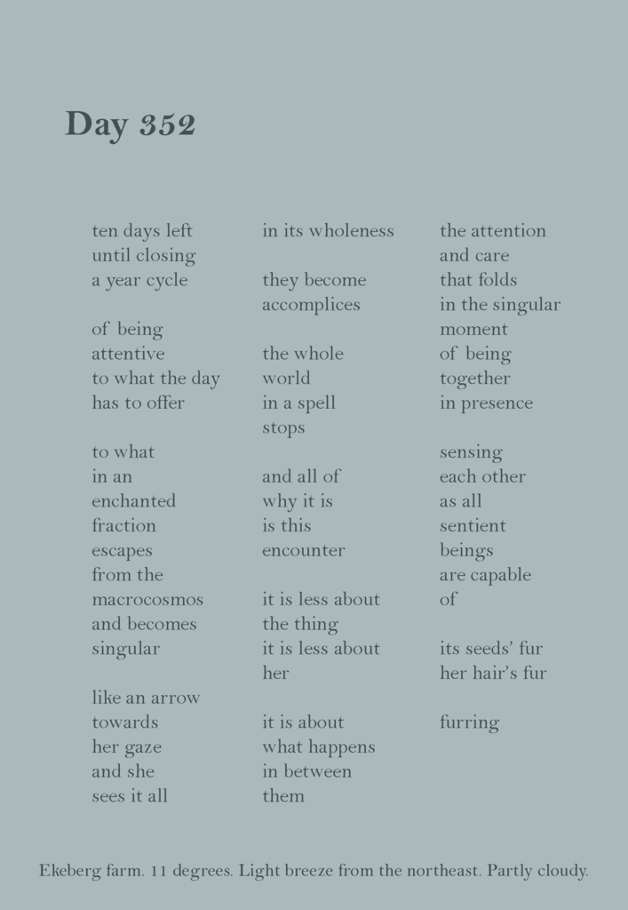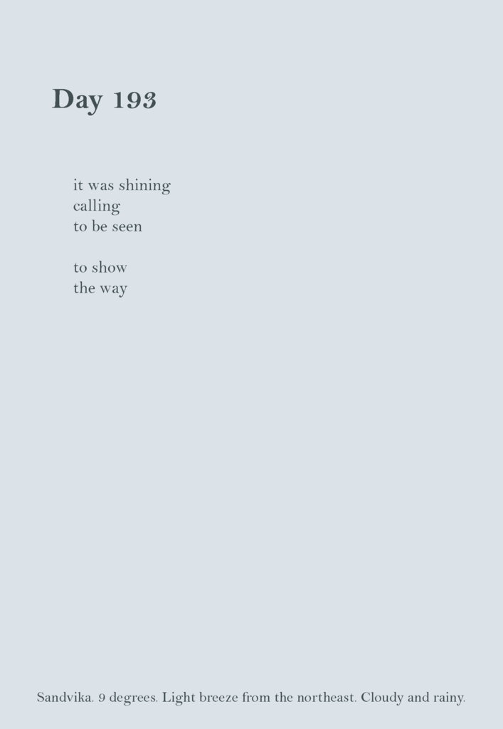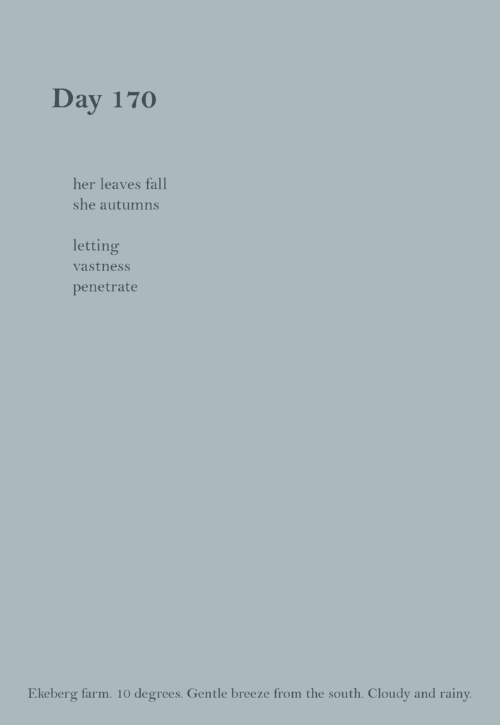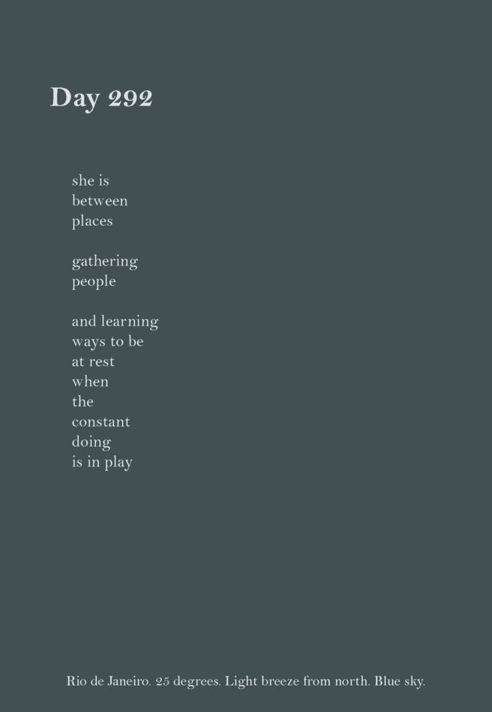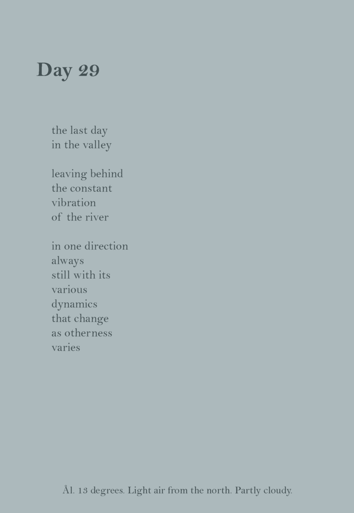is a compilation of 365 cards documenting one year of daily practice, consisting of a walk, a poem, and a weather registration.