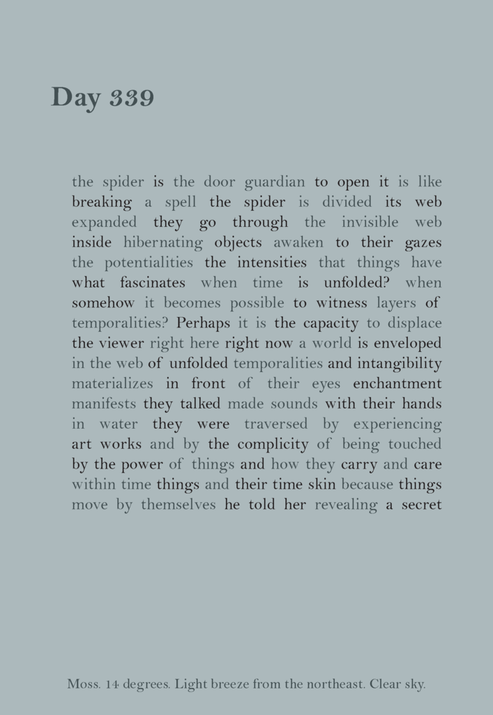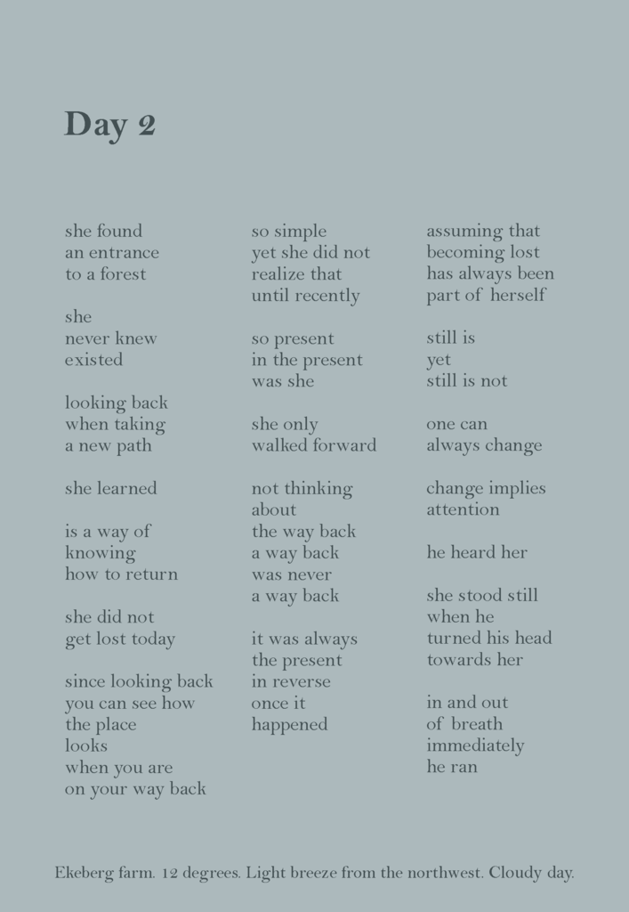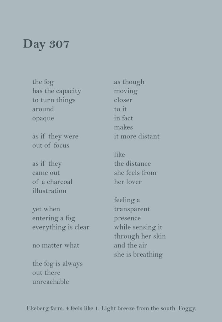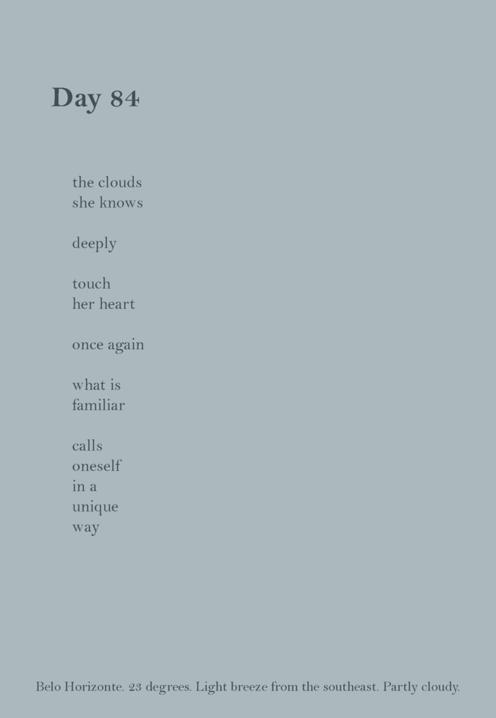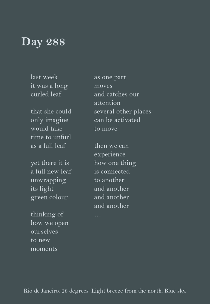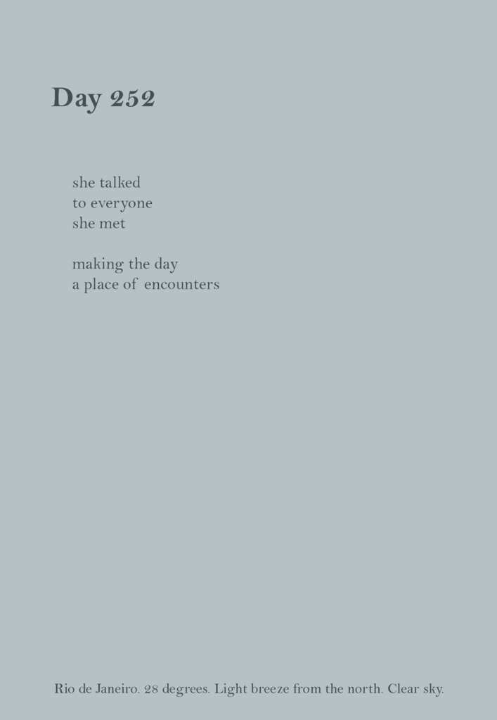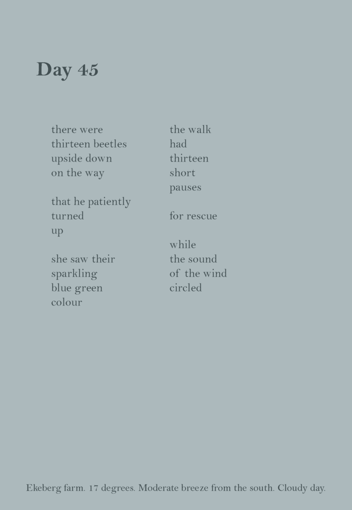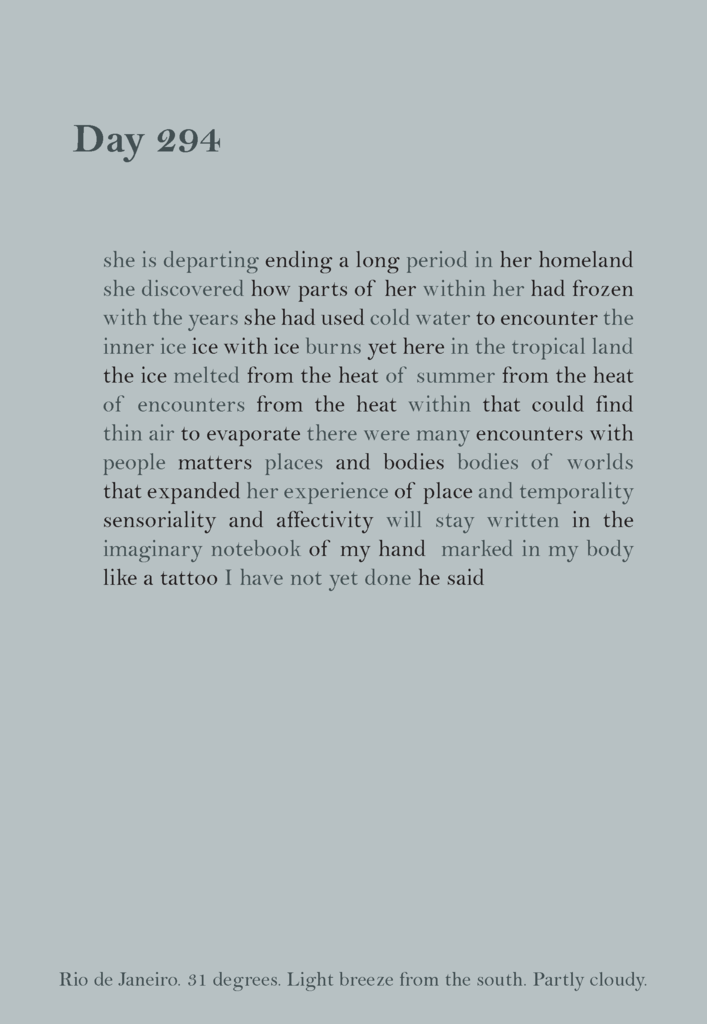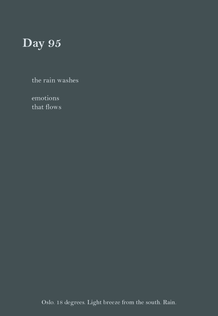 is a compilation of 365 cards documenting one year of daily practice, consisting of a walk, a poem, and a weather registration.