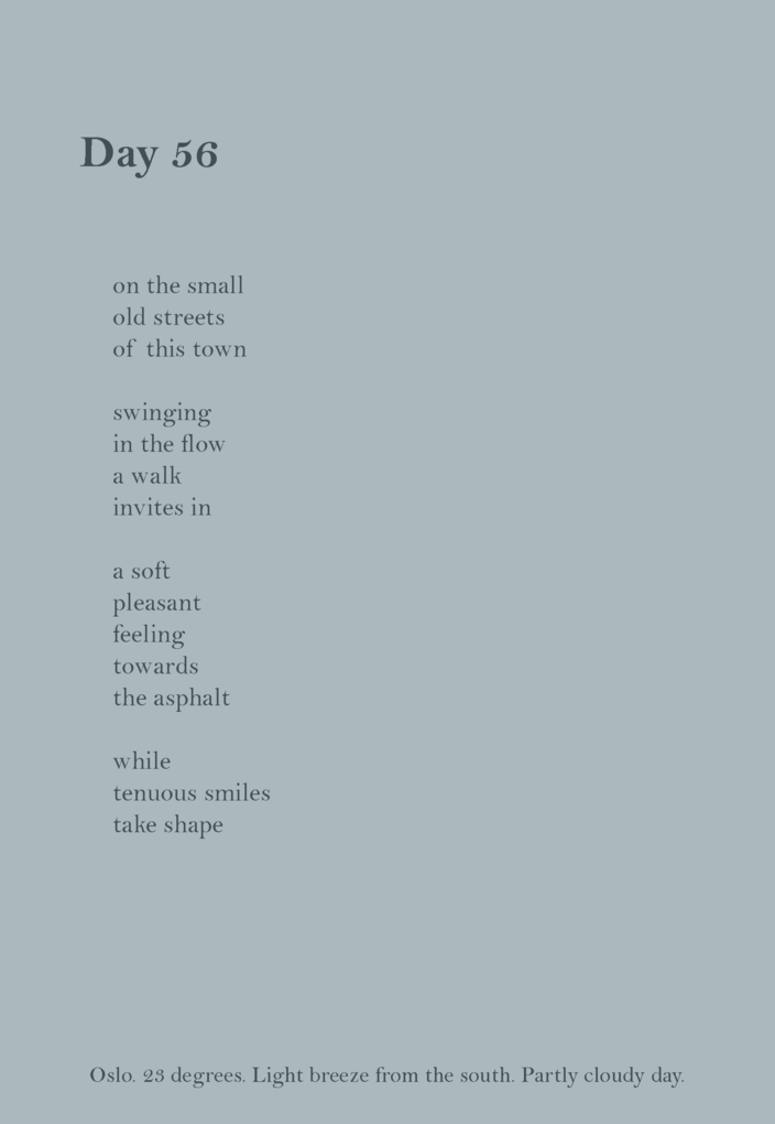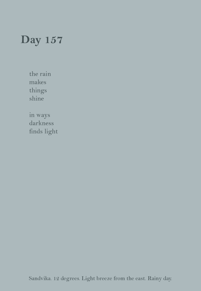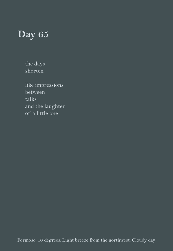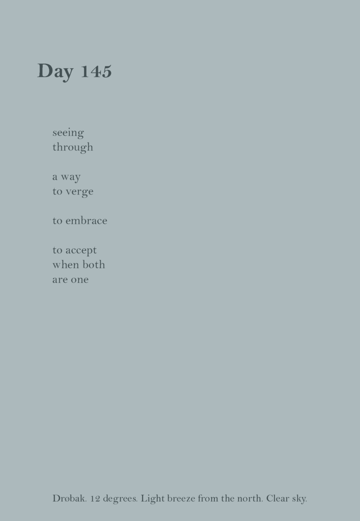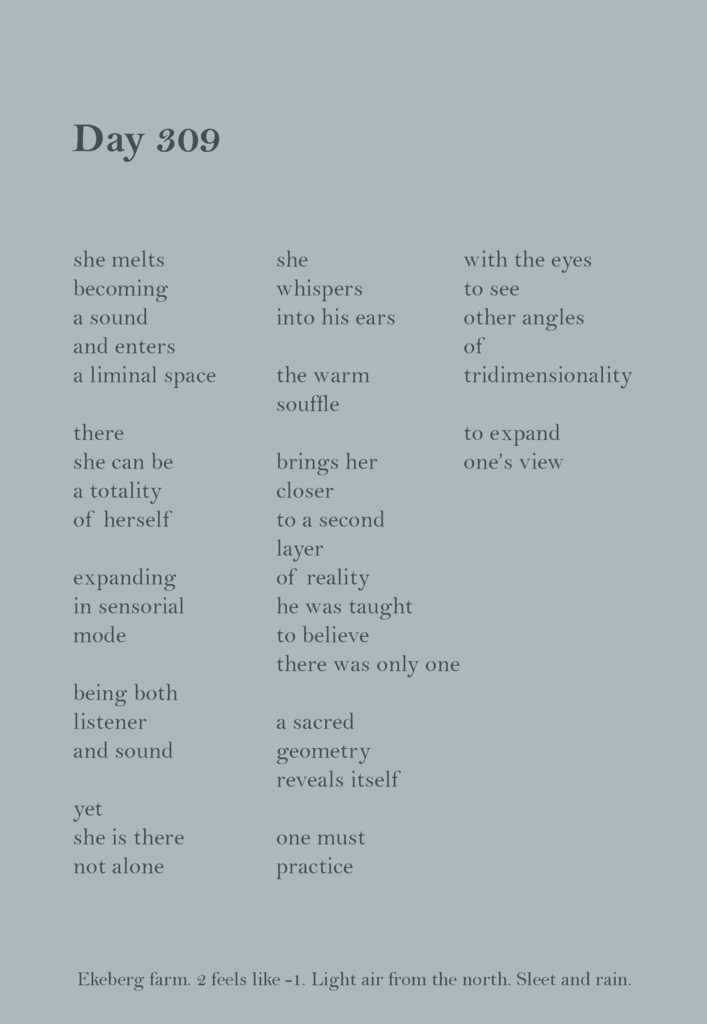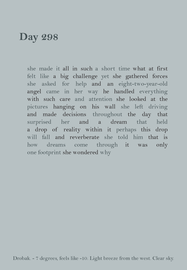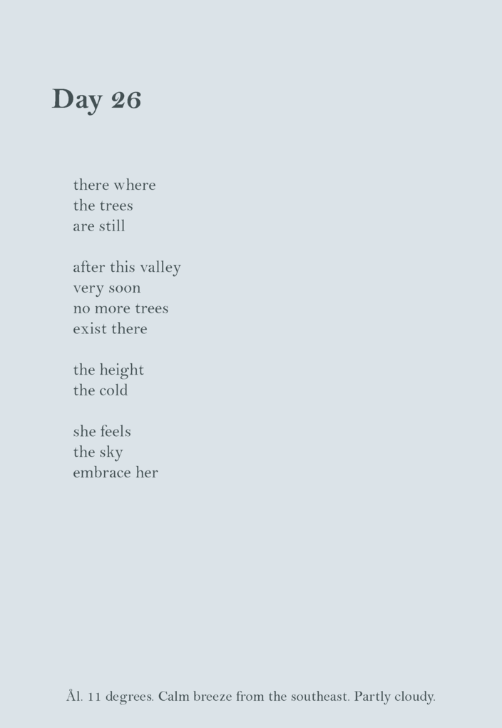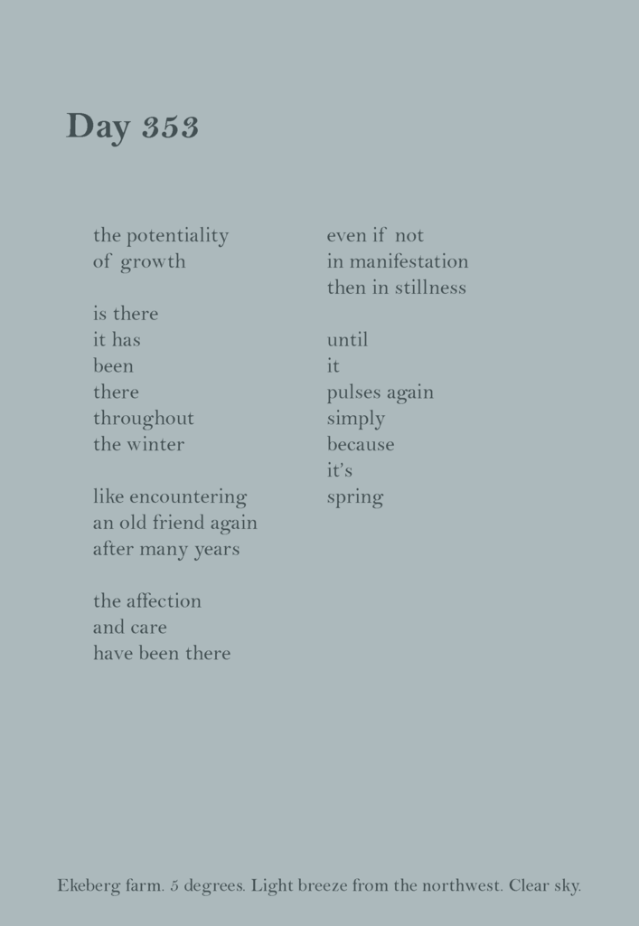 is a compilation of 365 cards documenting one year of daily practice, consisting of a walk, a poem, and a weather registration.