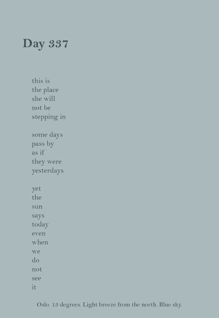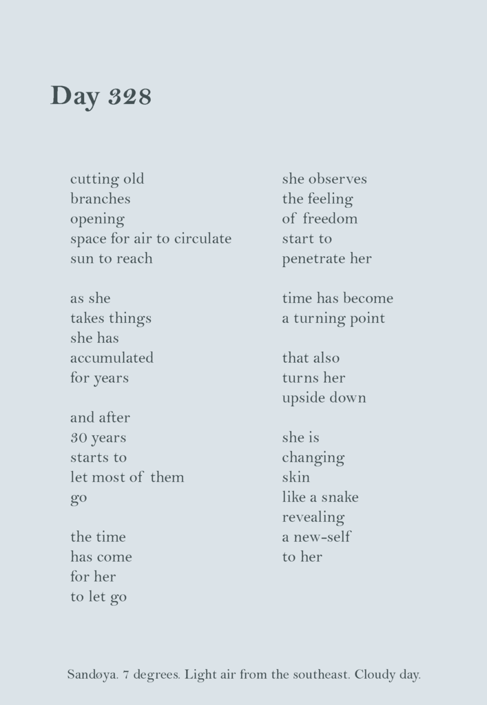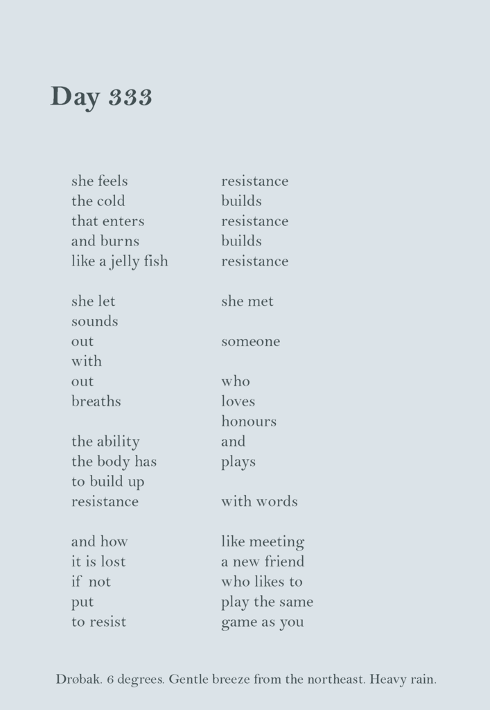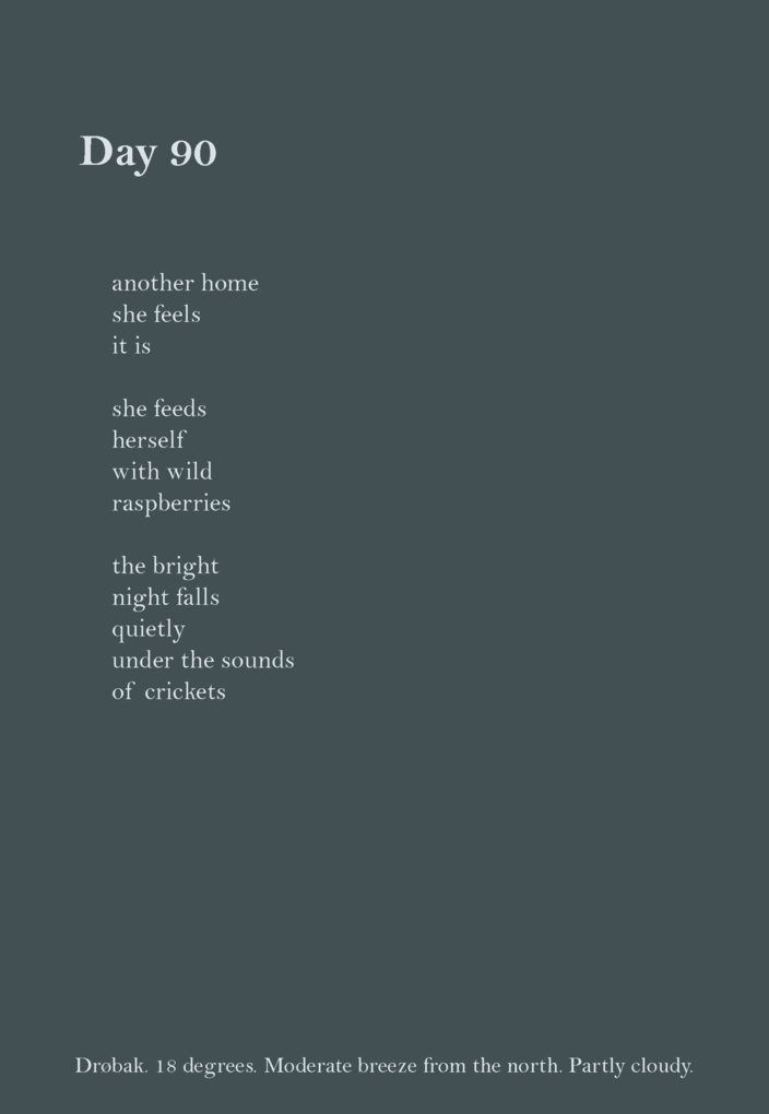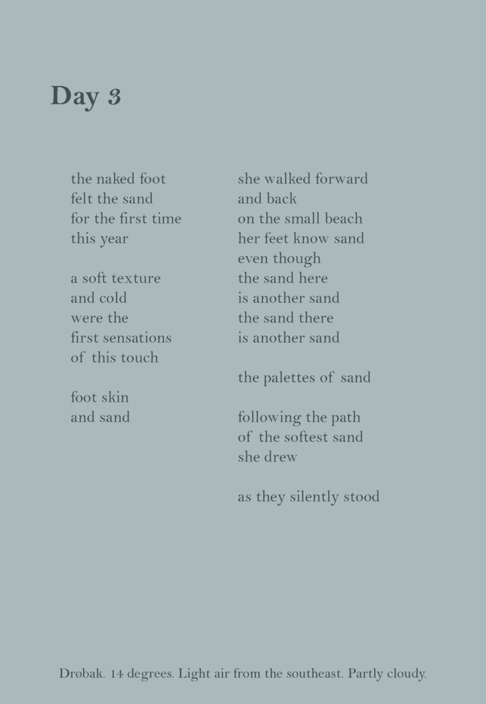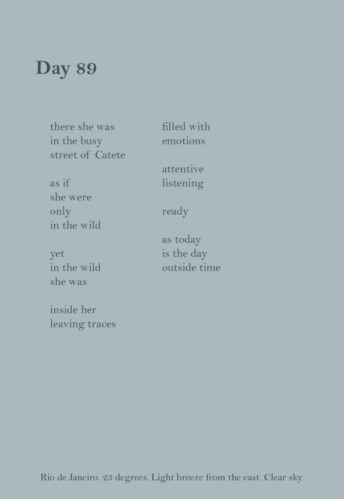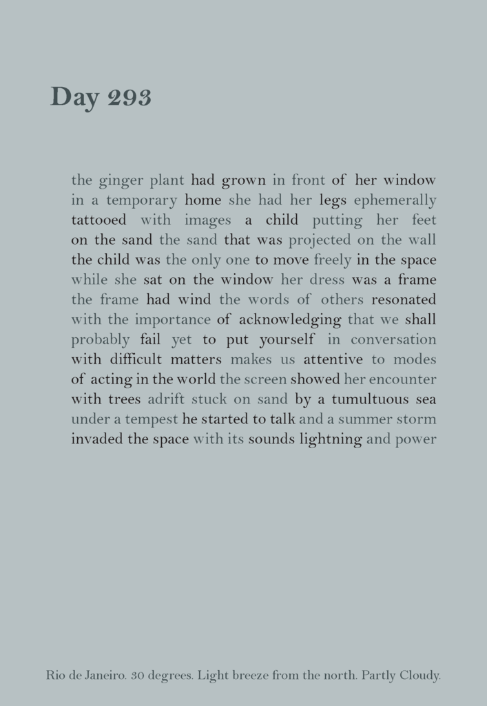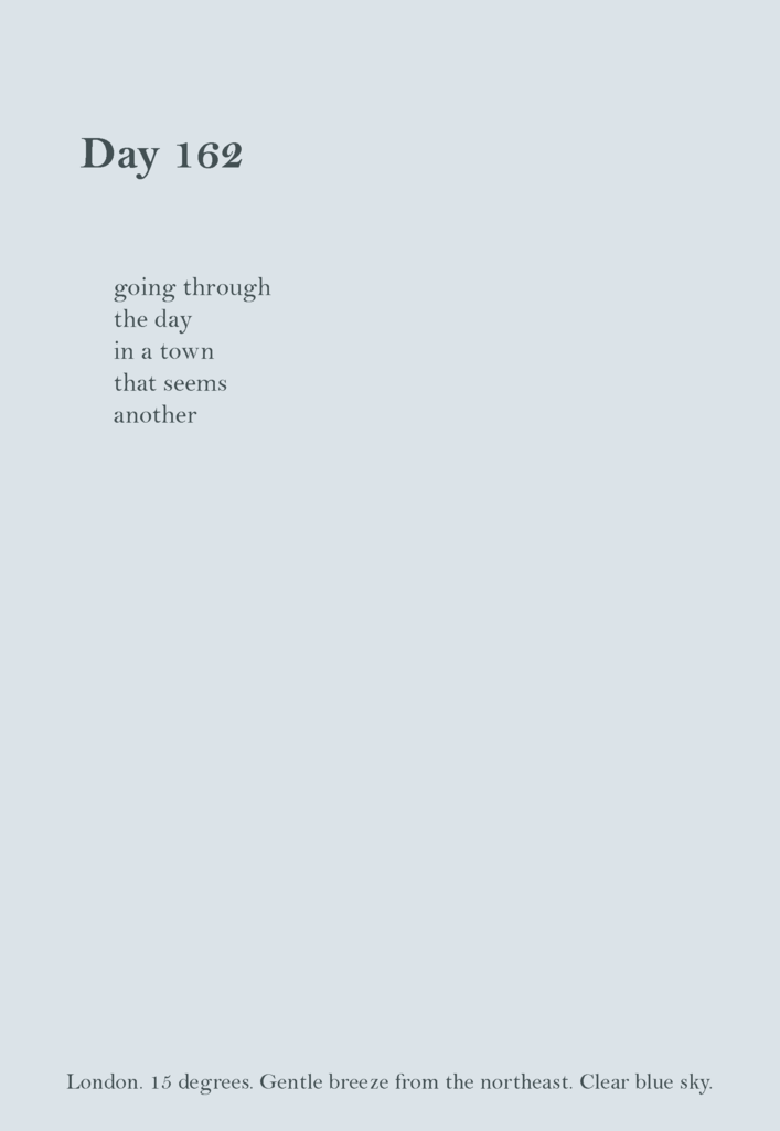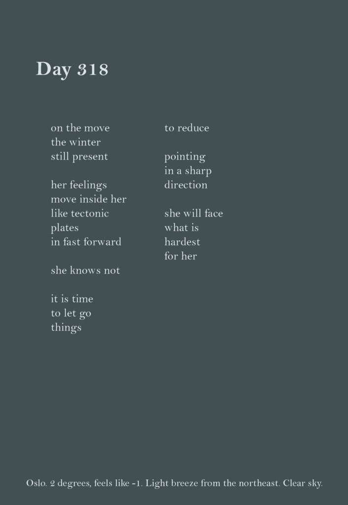 is a compilation of 365 cards documenting one year of daily practice, consisting of a walk, a poem, and a weather registration.