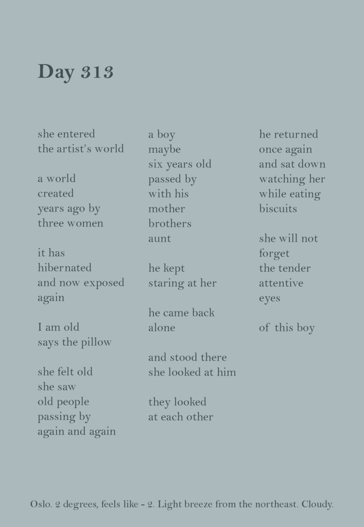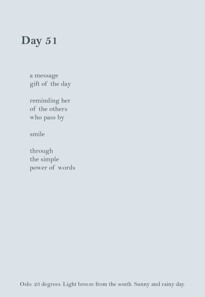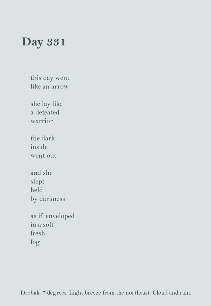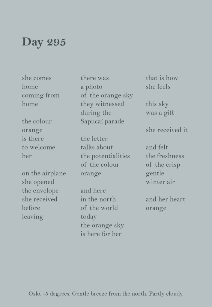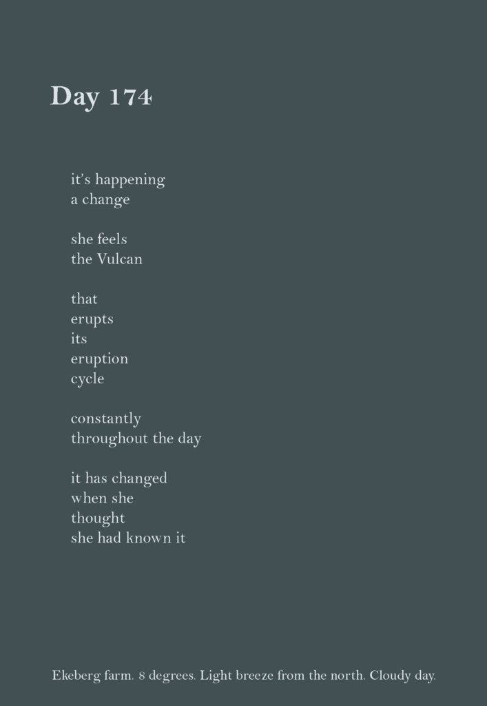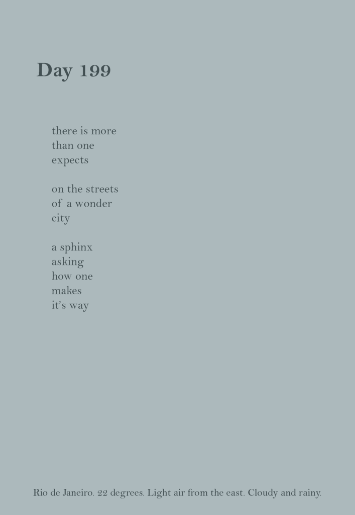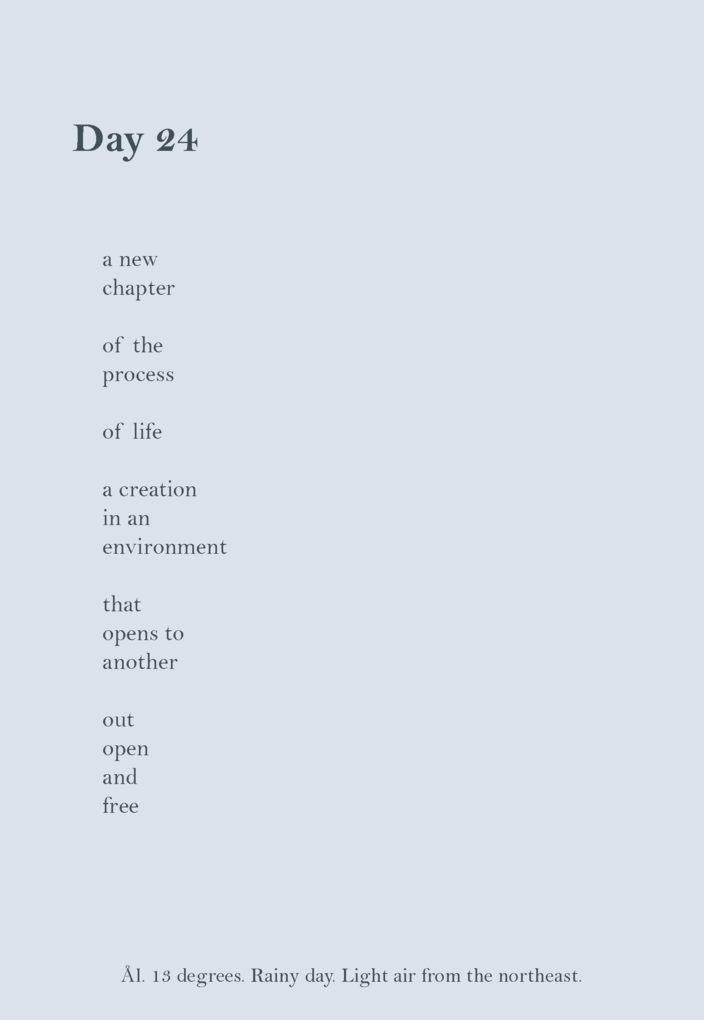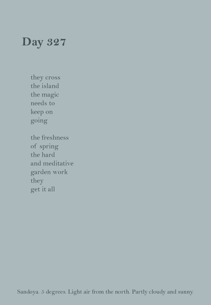 is a compilation of 365 cards documenting one year of daily practice, consisting of a walk, a poem, and a weather registration.