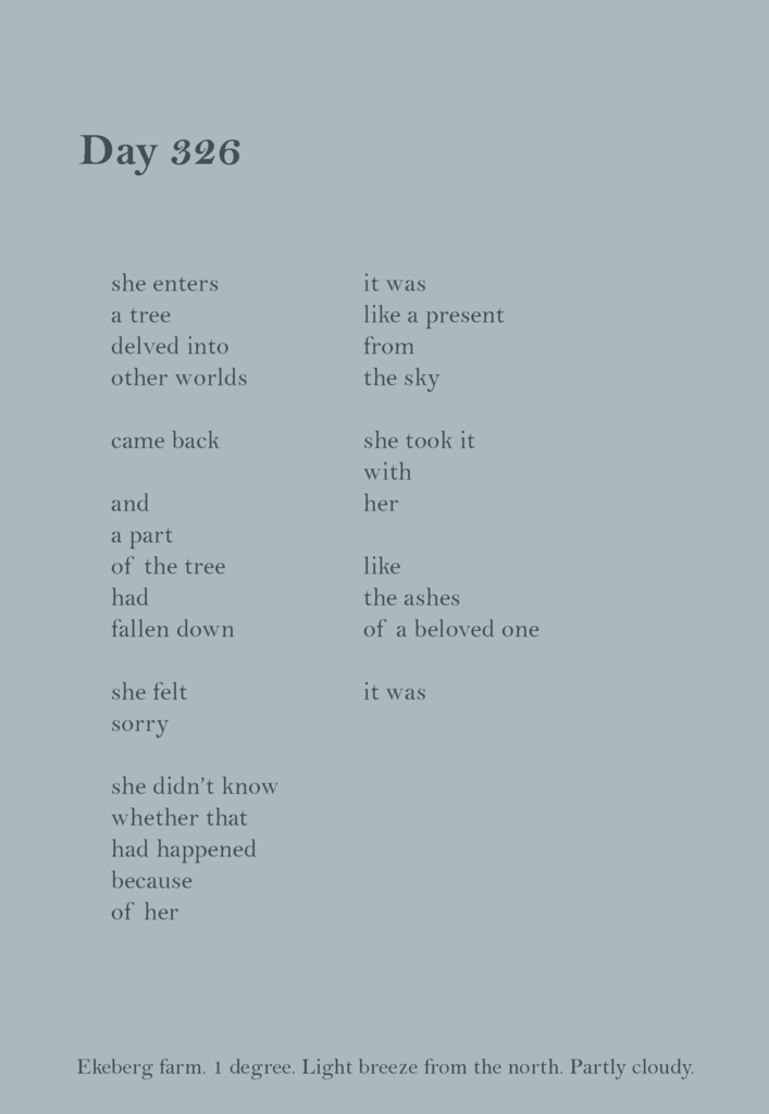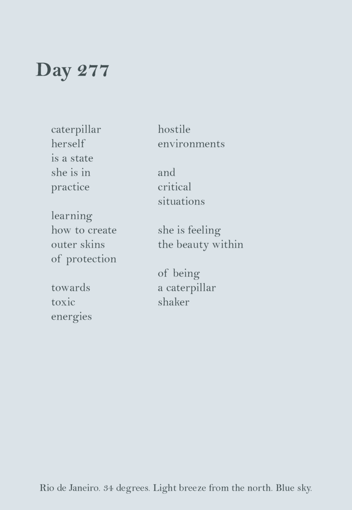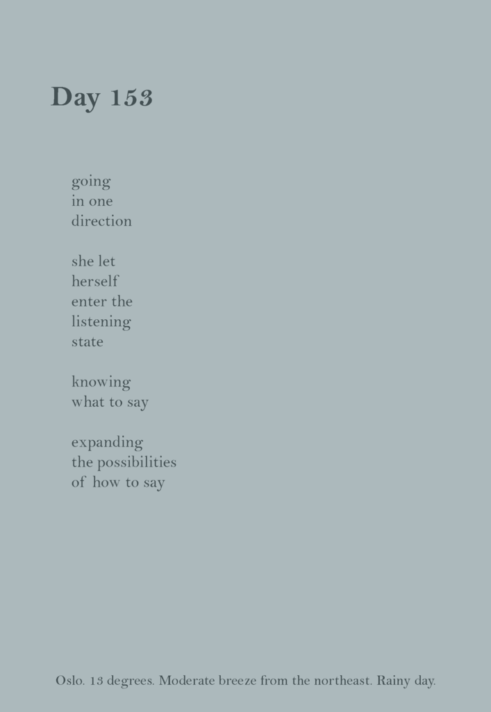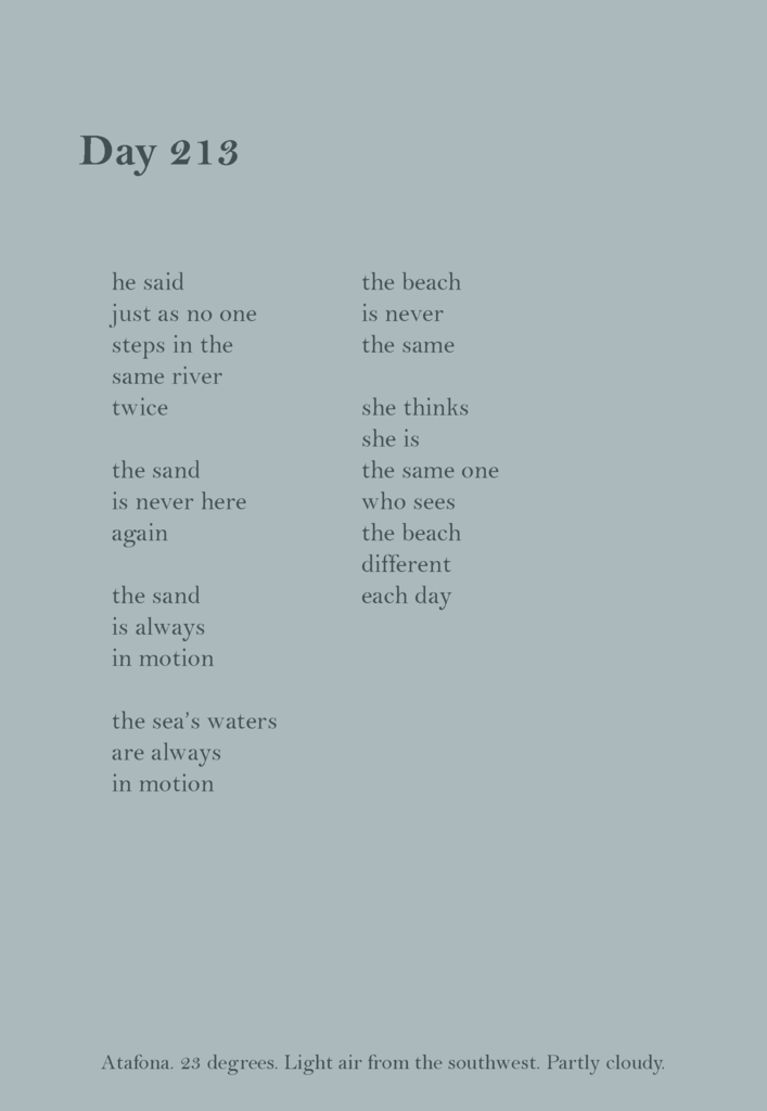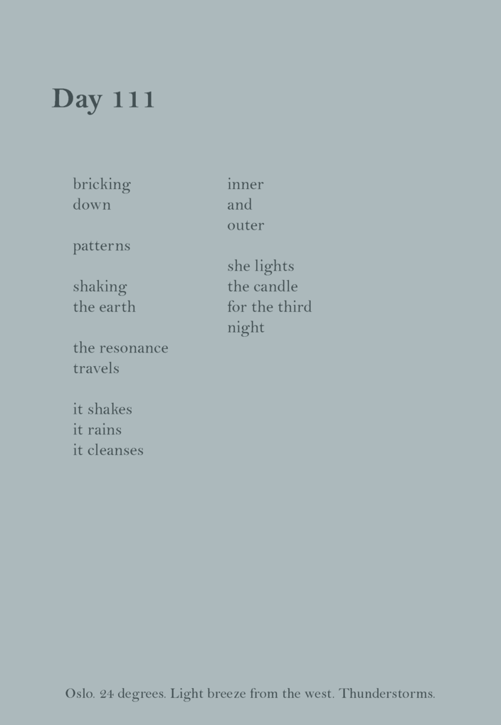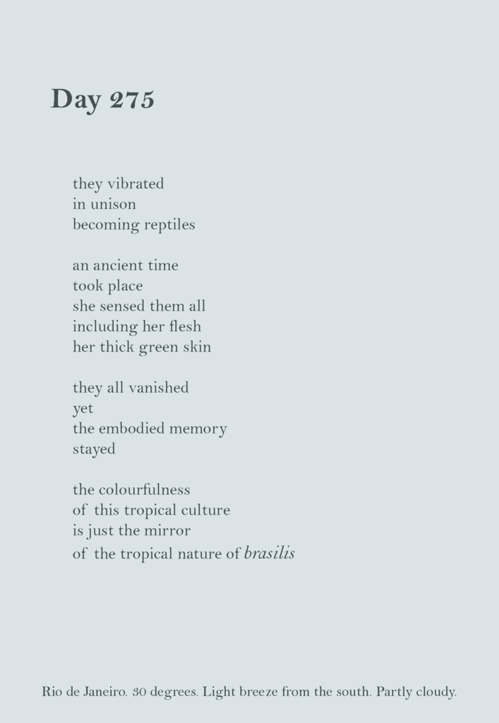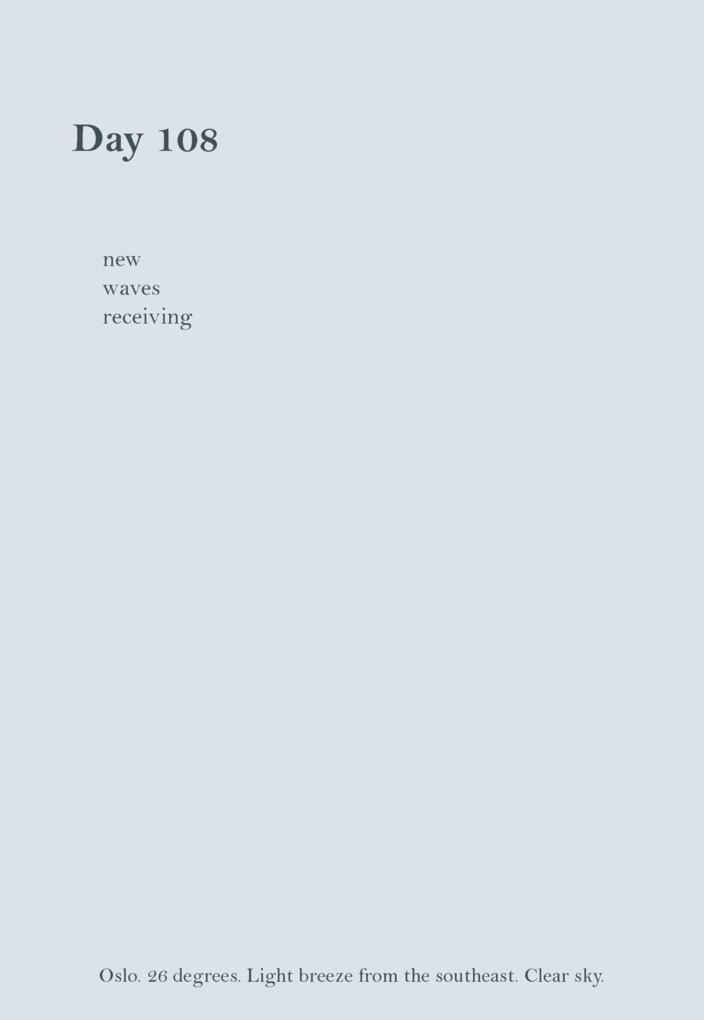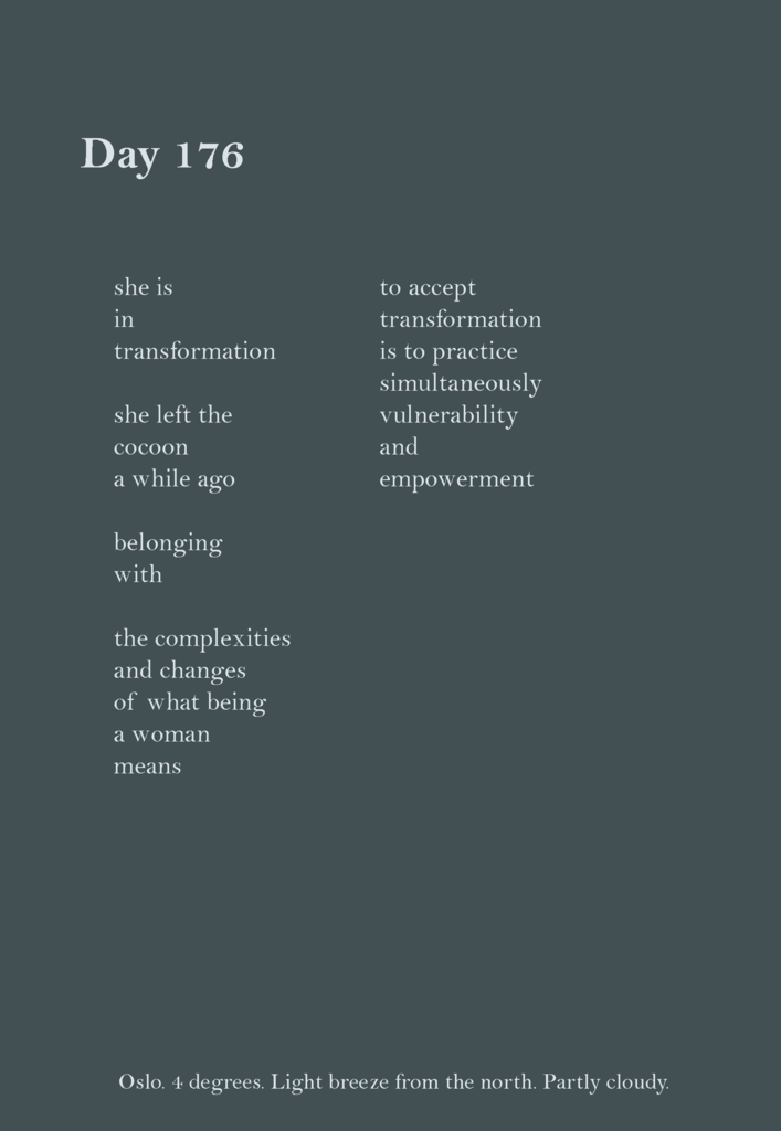is a compilation of 365 cards documenting one year of daily practice, consisting of a walk, a poem, and a weather registration.