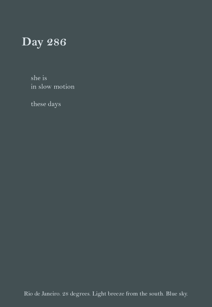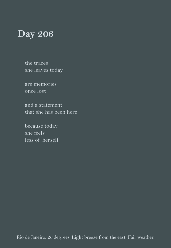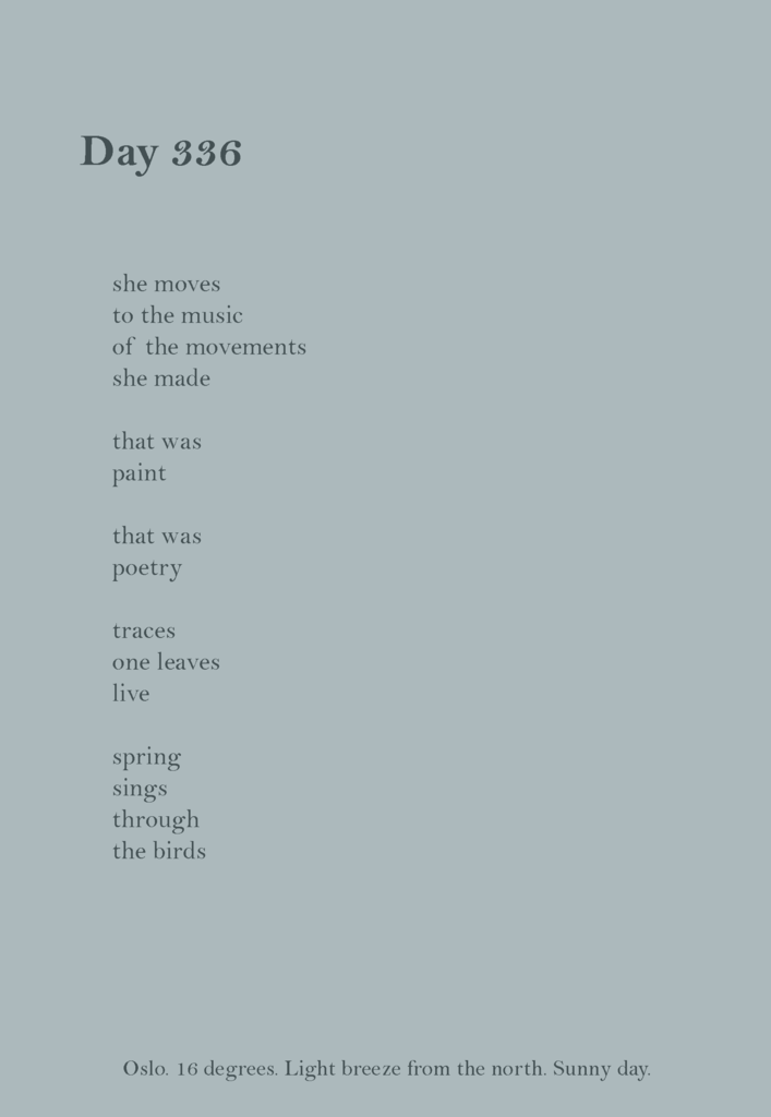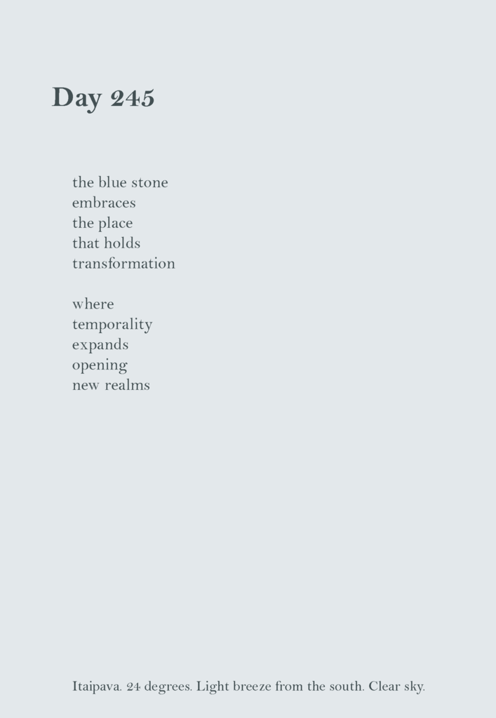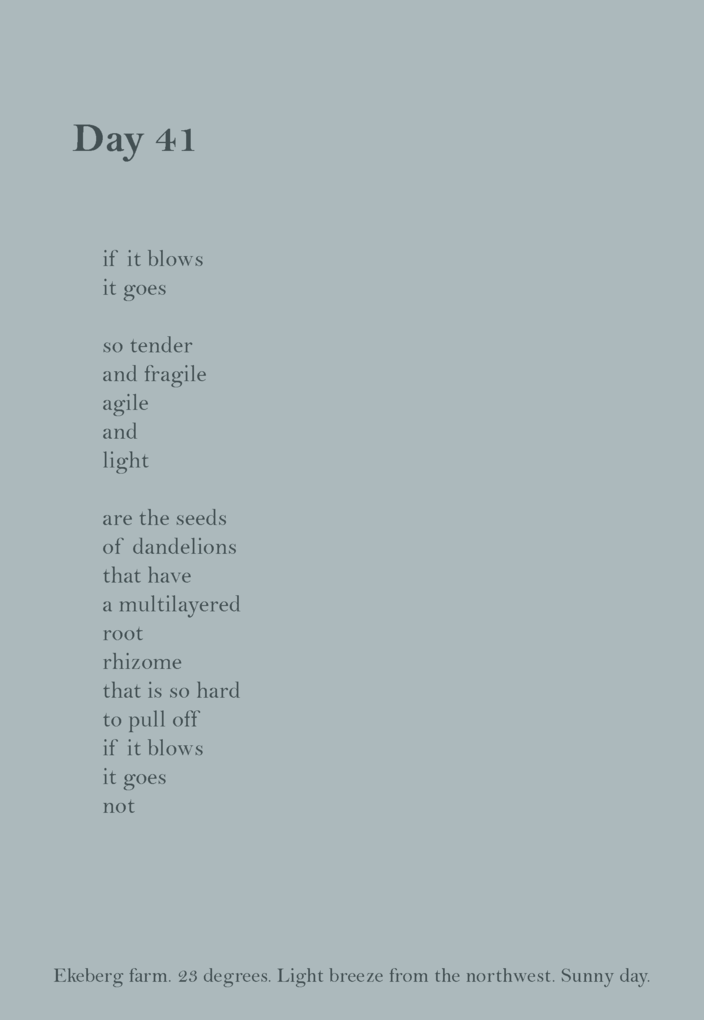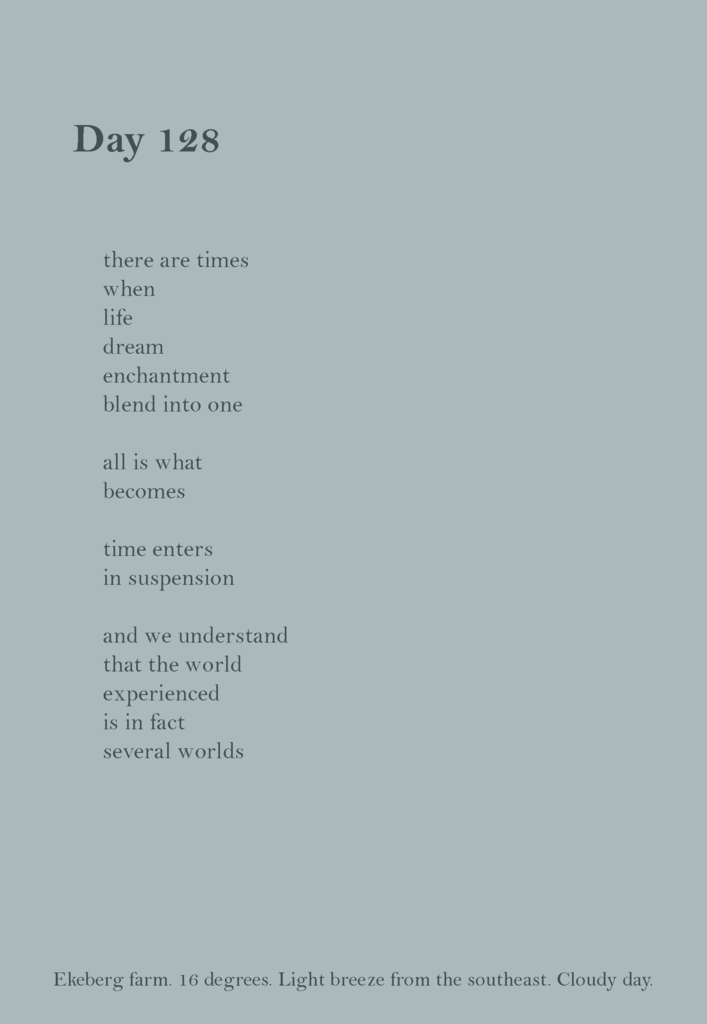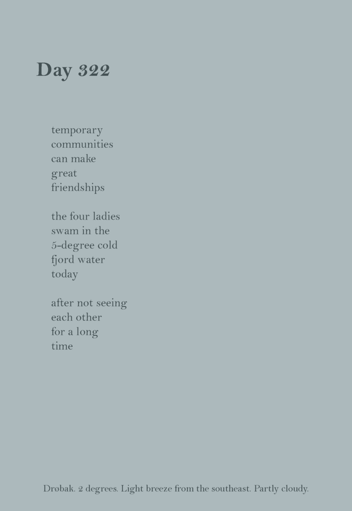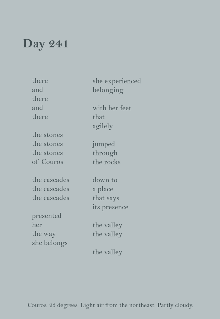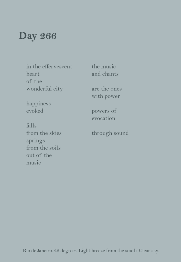 is a compilation of 365 cards documenting one year of daily practice, consisting of a walk, a poem, and a weather registration.