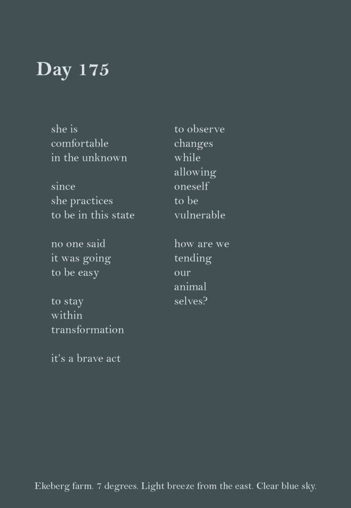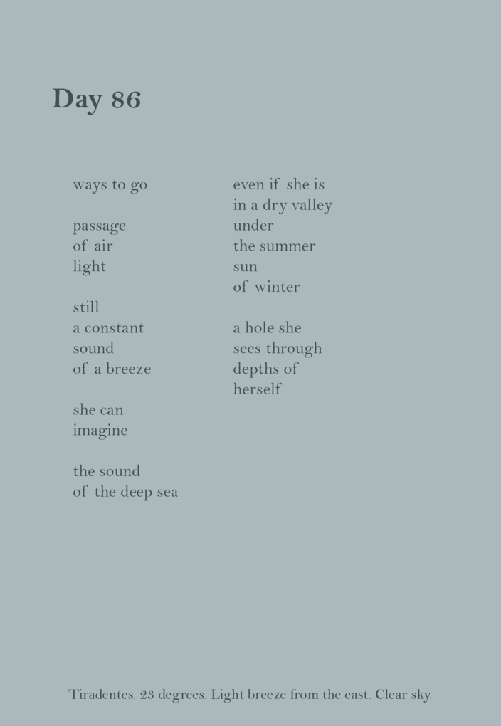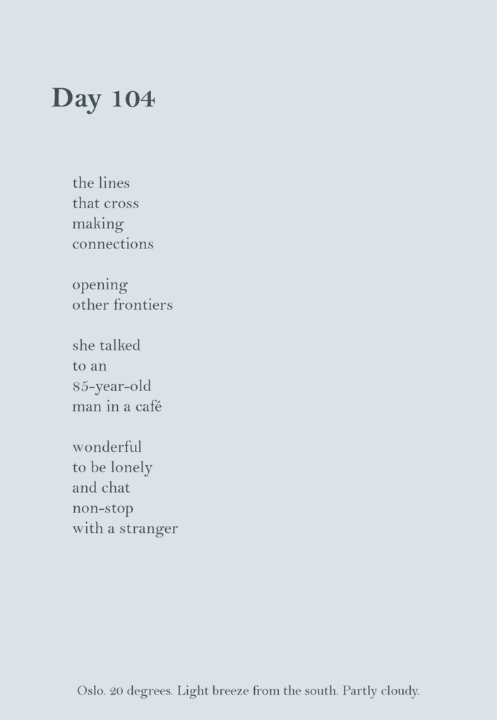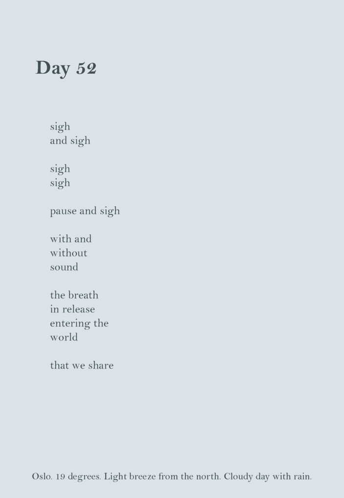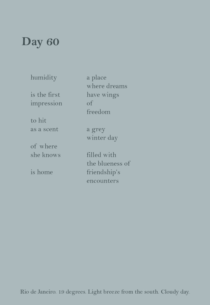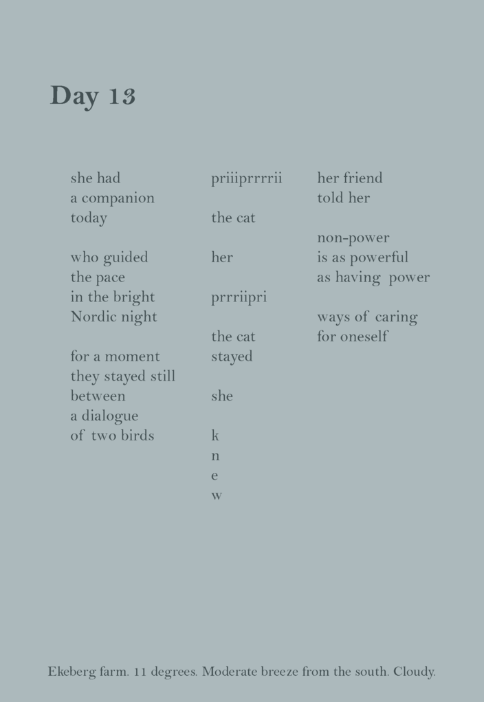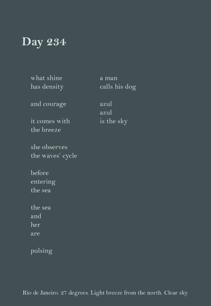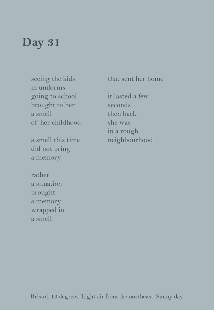 is a compilation of 365 cards documenting one year of daily practice, consisting of a walk, a poem, and a weather registration.