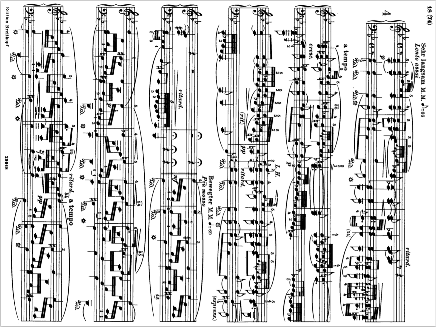 The second important concept that influenced this particular experience is the Barthesian idea of “somatheme”, or “figur[e] of the body” (Barthes 1991a, 307). The whole essay “Rasch” is based upon the idea that a fundamental part of Schumann’s music can only be grasped, experienced, and understood through the body of the performer and of the listener. The “figures of the body” provide a sort of second layer of the score, linked to and yet in fight against the musical text constituted by “grammar” and “musical semiology: … identification and arrangement of ‘themes’, ‘cells’, ‘phrases’” (Ibid.). For each of the Kreisleriana, Barthes sketches the respective “somathemes", which are determined by the movements of the hands of the pianist, by the affective impact of the accents on the body of the performer/listener (the “blows”, ibid. 299), or by the voice-like character of certain musical gestures.