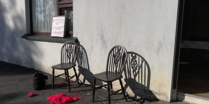- With two collapsible chairs and a sign that reads I listen to love stories, choose a place where other human beings gather or pass by.