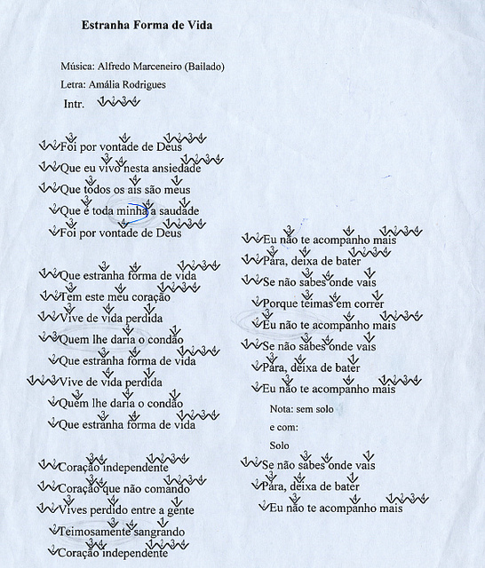 My rehearsal exercises at home changed with the material I had obtained from Arménio. In a few lessons, I had figured out how I could make his notes my own. I understood the logic and was able to apply it to fados I had learned before. I now started rehearsing by speaking through the lyrics before singing it. I tapped the meter with my hand on the table in order to follow the schemes I had made.