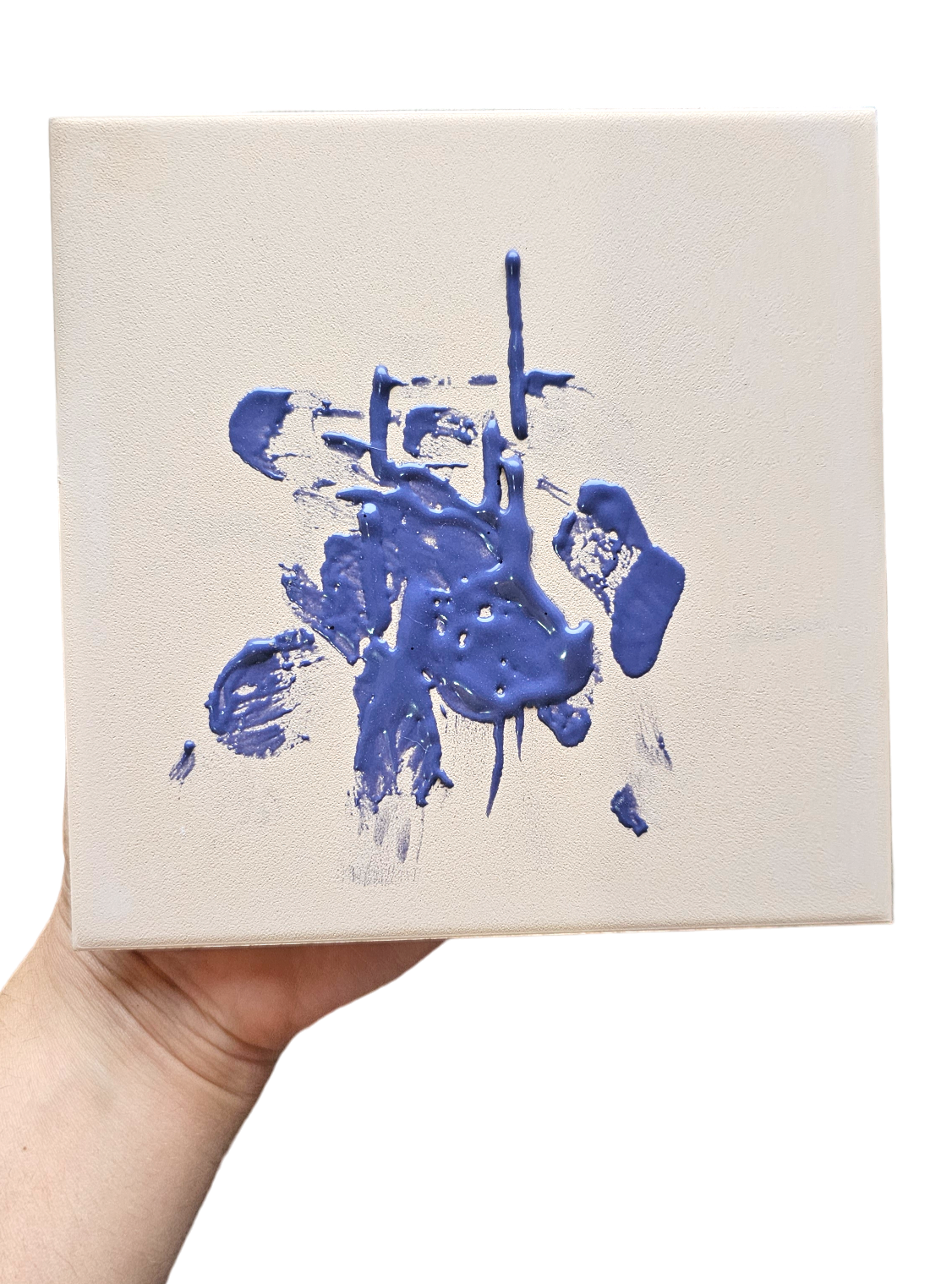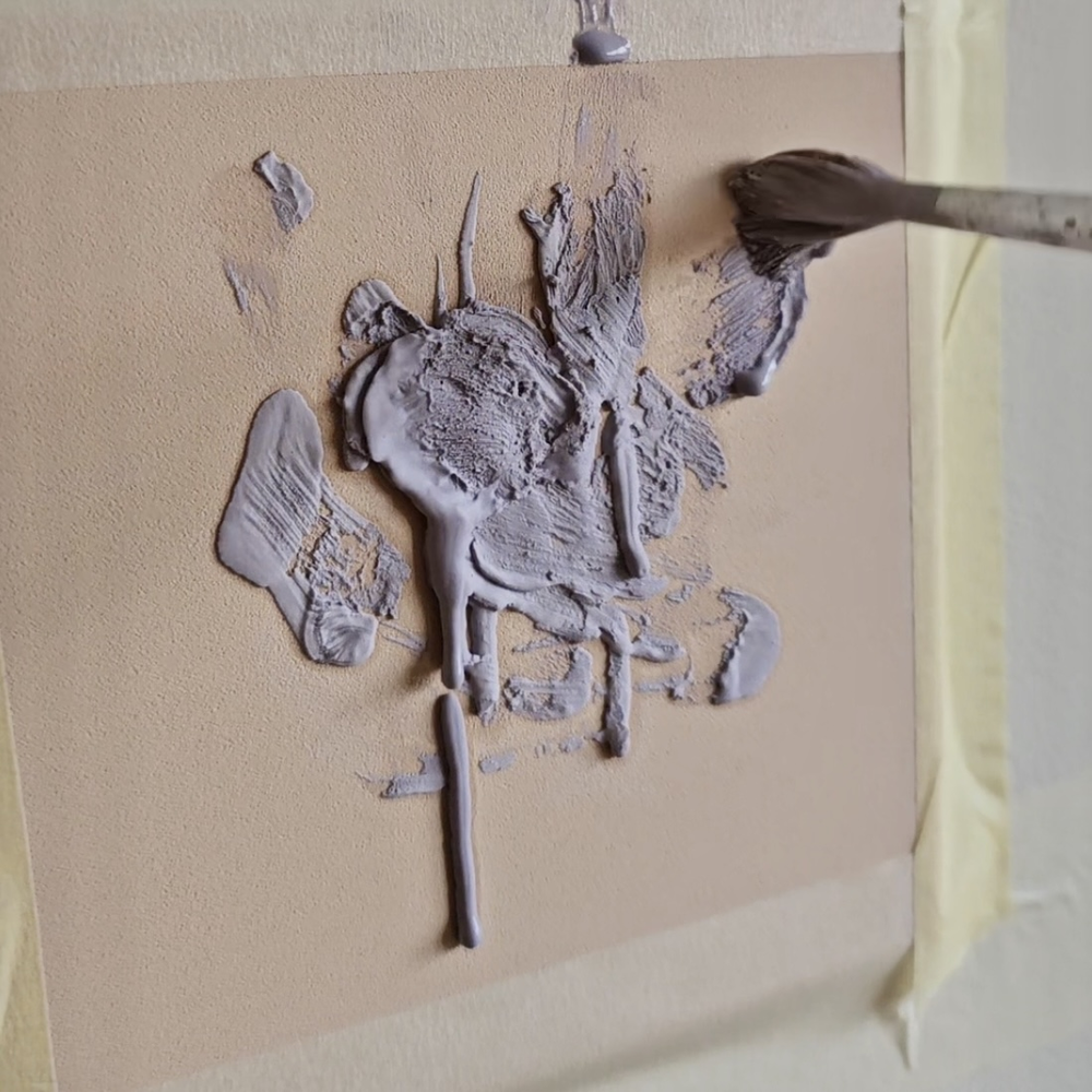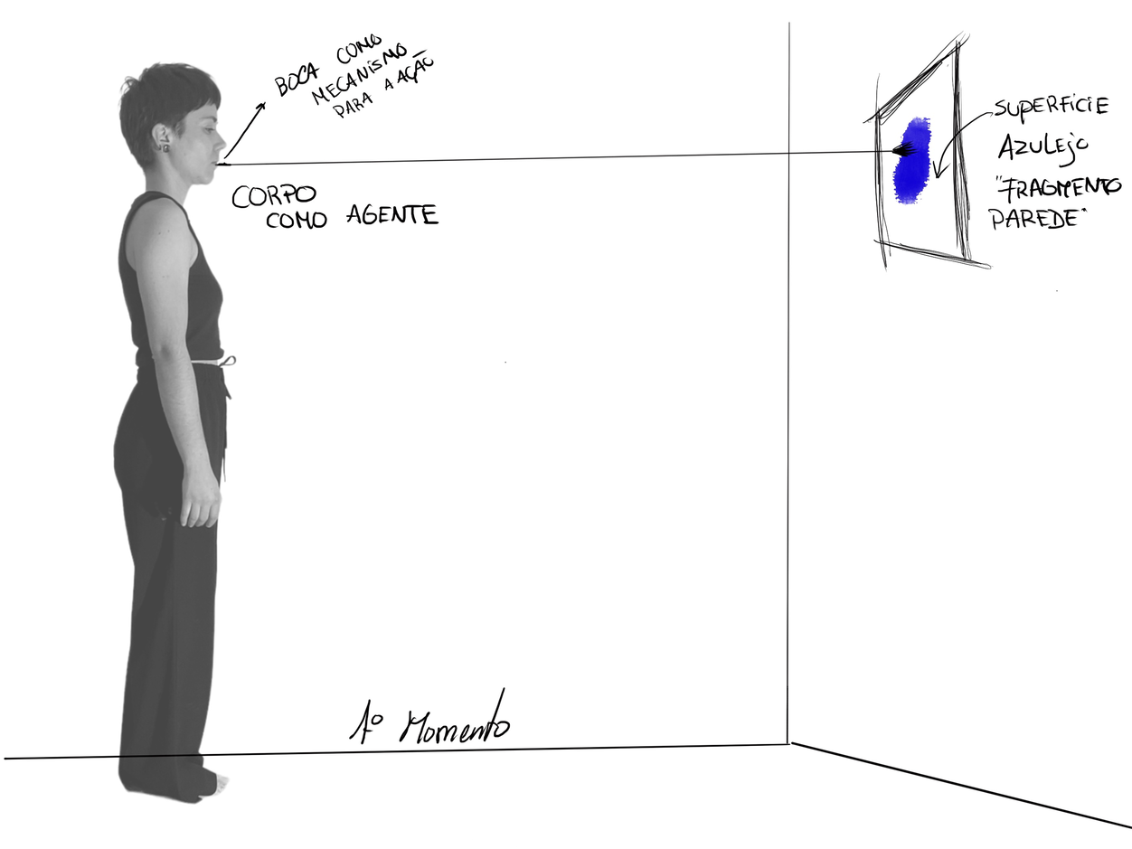 A abordagem inicial envolve a utilização do corpo como o agente que executa a ação, através do gesto de pegar o pincel pela boca. A partir daí, o movimento do corpo é transferido para a superfície do azulejo, onde a pincelada se transforma em uma mancha de tinta cerâmica.