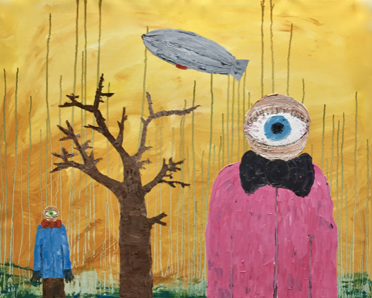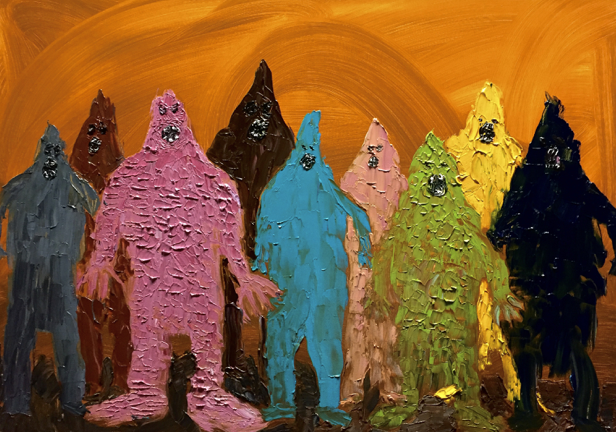I think the paintings, sculptures and films I make are quite naive and a bit grotesque. I've been thinking about my titles for artwork, where I often try to find something universally human, or again, something with archetypes mixed into it. As an example, I have had quite a few paintings where two people are fighting, and called them things like "Eternal battle" and the like. But it must be said that I don't think titles are that important, so often it just becomes something stupid on purpose such as "A crazy man", "Happy dog" or something else very simple and slightly silly.
