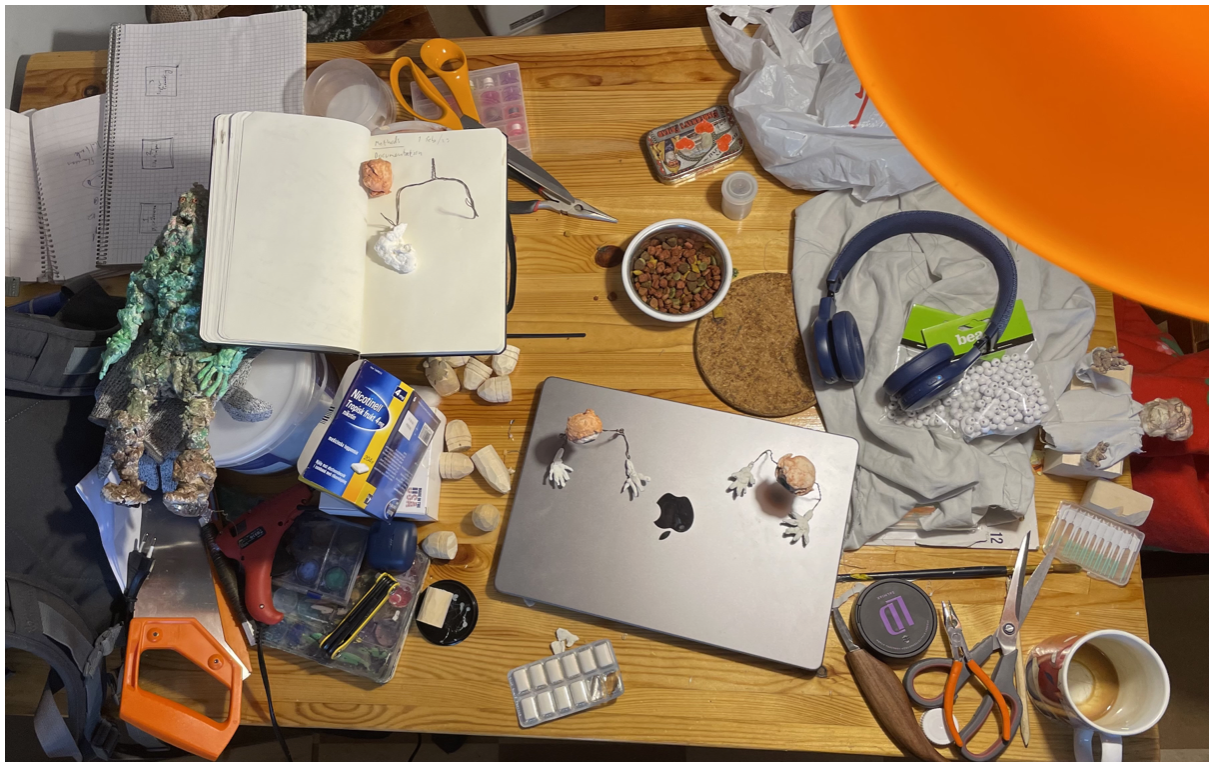 But I'm pretty sure that over time I've gotten better at the more artisanal aspect. Of course, I took that with me into the work on the film. It has also made a huge difference that I have experience in building things in my studio, so even though it initially doesn't have much to do with my art, it has nevertheless become part of my practice, e.g. a I have built some small coffee tables from euro pallets, for example. Those things have helped a lot in the construction process for the scenography and figures; that I have some experience in building things, but of course ceramics and painting in particular are important. I have built a ship for the crew and Otto out of popsicle sticks which probably would have turned out less well if I had built it without any experience. Here I think in contrast to sitting in front of my computer and editing video as I did before.