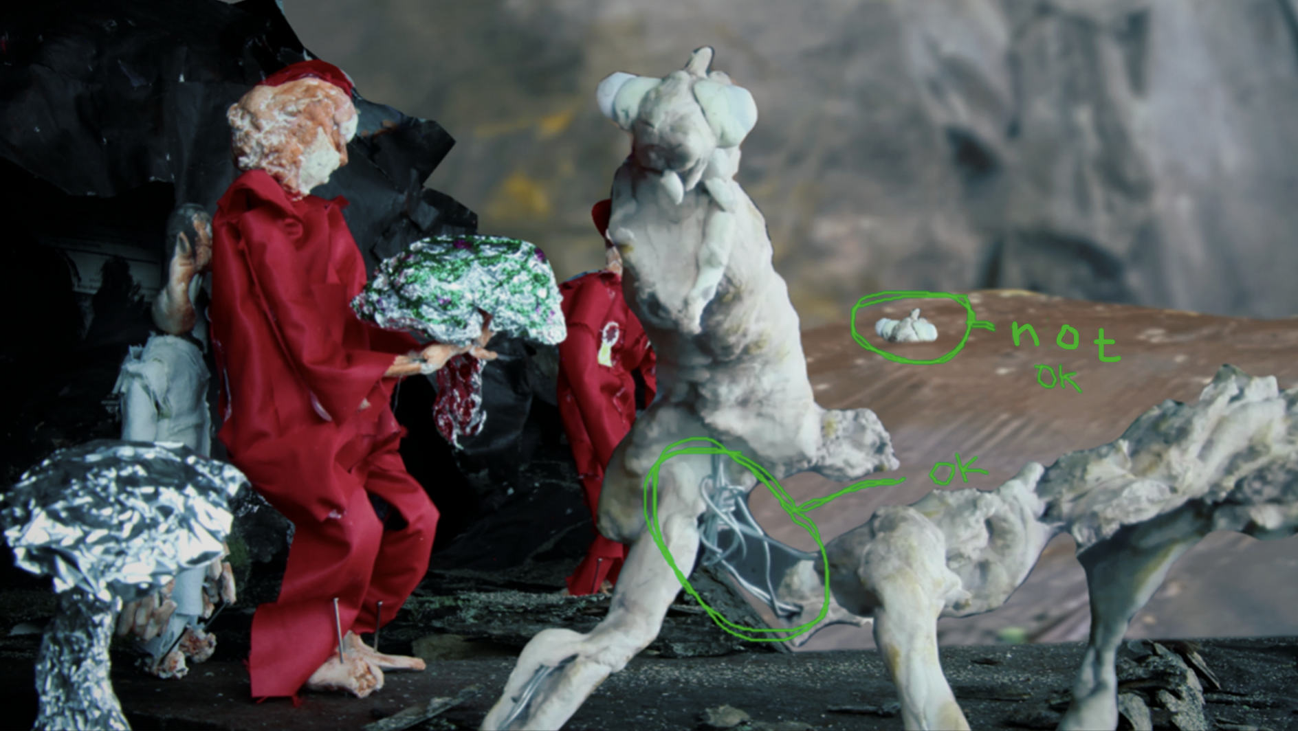 Perhaps it is like this: it's ok to be slobby with the material, but technical things, (here I am thinking of e.g. editing and post-production) is not ok: above you can see a film still from "The Holy Mushroom" where I try to illustrate this. Here you see steel wire in a skeleton lizard, and next to it, a technical sloppiness has occurred and you can see its eyes in smaller size next to it. It's not okay with the eyes, but the fact that you can see the wire is okay (although I'm a bit in doubt about the wire, now that I think about it again, maybe I should have done it "better") But I think it's about, after all, taking it seriously, one might say, i.e. it must be thoroughly worked through.