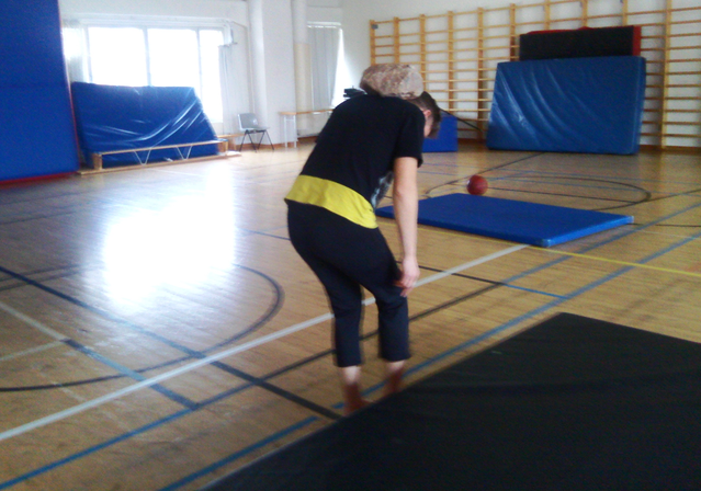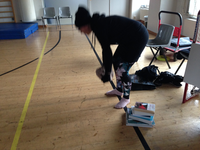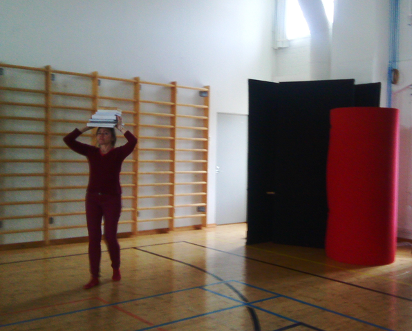 Kantaminen performanssina ja harjoituksena, Pilvi Porkolan praktiikka-esittely jaettuna kokemuksena. Paikkana liikuntasali 525, mahdollisimman epäesteettinen ympäristö, sekava, täynnä erivärisiä urheilumattoja ja teippejä lattiassa, mutta avara ja tilava, mahtuu liikkumaan. Pilvi on tuonut meille kannettavaa: ruukkukasvin, ison graniittimöhkäleen, pienen graniittilohkareen ja kirjapinon. Alkuravistelulämmittelyn jälkeen katson ruukkukasvia ja ajattelen, että se on kuin luotu minua varten, mutta iso graniittimöhkäle houkuttaa. Hanna kiirehtii valitsemaan kukkaruukun, ja ennen kuin ehdin miettimään, Tero on ottanut graniittimöhkäleen, minulle jää kirjapino. Sillä hetkellä en huomaa pienempää kiveä. Kuljen kirjapino sylissä kuin sylillinen halkoja, sitten nostan sen pään päälle ja kuljen pidellen siitä kiinni molemmin käsin. Pino on aika tukeva ja melko painava, mutta sitä jaksaa hyvin kantaa päällään, käsivarret lähinnä väsyvät olemaan ylhäällä. Menen seisomaan mustan ja punaisen mattorullan eteen, koska minulla on punaiset vaatteet, ja kokeilen, voisinko laskea toisen käden alas hetkeksi ja kyllä se onnistuu. Toistan saman toisella kädellä. Siirryn kantamaan kirjoja oikean lonkkani päällä, pino mahtuu siihen nippa nappa - joudun änkeämään Carlsonin kirjan pinon ja käsivarteni väliin puoliksi väkisin. Sitten lasken kirjapinon patjalle ja ryhdyn siirtämään pinon huoneen poikki kirja kirjalta. Pikkukivi on vapaa, ja kokeilen laittaa sen pääni päälle ja kumartua samalla ottamaan seuraavan kirjan, sekin onnistuu. Matkalla toisen pinon luo annan kirjan Hannalle, ja jatkan kulkemista pikkukivi pään päällä. Sen on tarpeeksi pieni, litteä ja karhea, jotta se pysyy siinä melko hyvin. Hetken kuluttua otan kiven käteeni ja alan heiluttaa käsivarttani kaaressa. Pienenkin kiven paino antaa pyöritykselle lisäpotkua, venytystä - ja sitten aika onkin jo loppu...