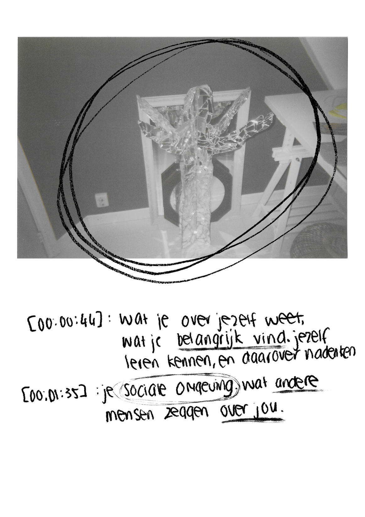 [00:18:20] De ruimte tussen het fotograferen en foto's analyseren is wel belangrijk. Je moet ruimte hebben om na te denken, verwerken wat je wilt enzo. Maar als er een te lange tijd tussen zit moet je voor de tweede keer nadenken waarom je wat hebt gefotografeerd. Daarin tegen is het ook wel een interessant idee om na een maand of 2 terug te kijken naar je foto's. Opzich is het wel leuk dat je van een afstand kan kijken naar de foto's en kan denken 'oh ik fotografeerde dit of dat, of beseft hoe je een tijd terug dacht over het zelfbeeld.' Het voelt alsof je naar iemand anders kijkt en zelf weer nieuwe ideeën hebt bedacht over jezelf beeld nu.