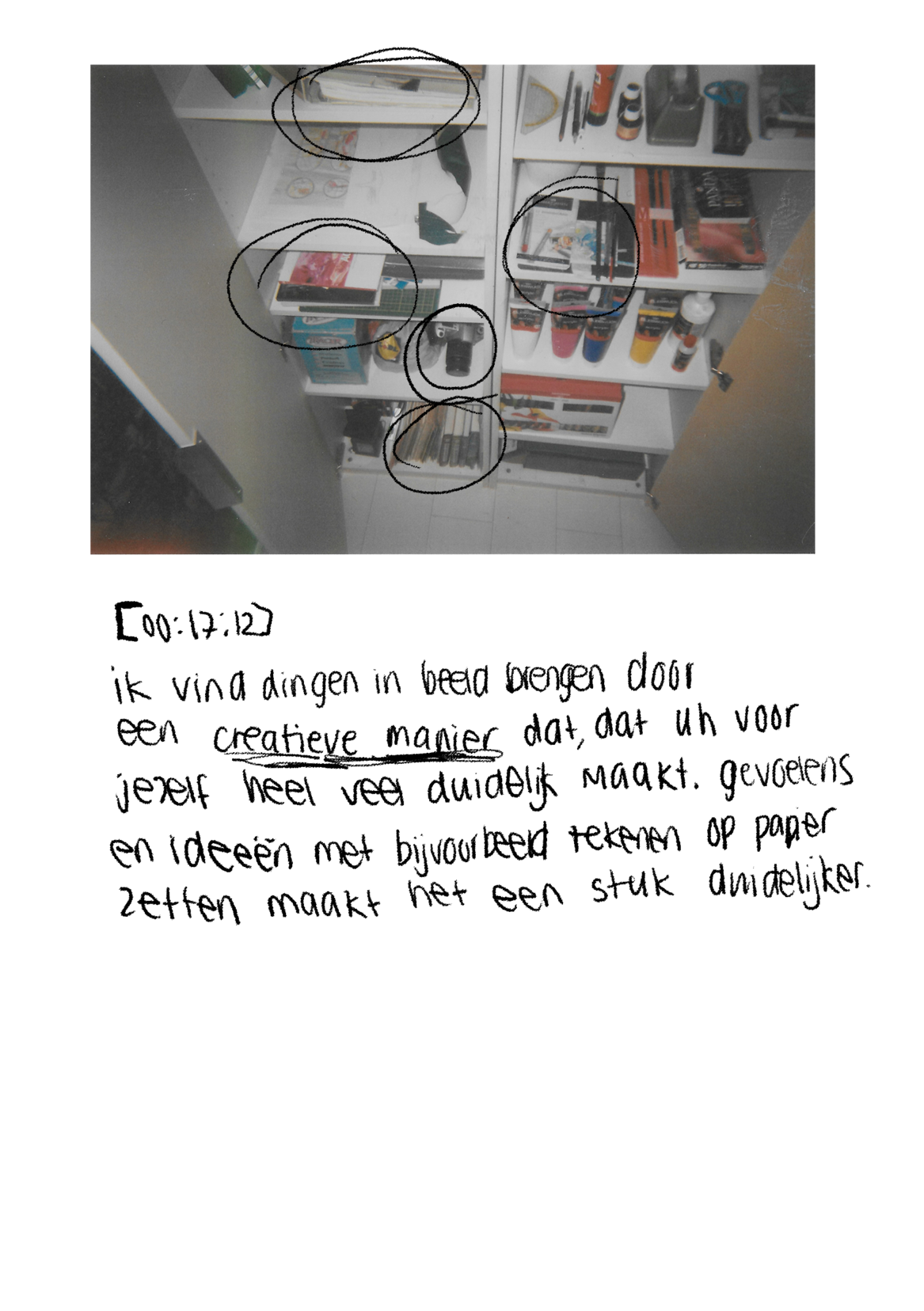 Hierna hebben we de foto's erbij gepakt, heb ik aangegeven dat we de foto's gaan analyseren net zoals het vorige moment. Heeft hij een moment gehad om de foto's op zich in te laten werken en heeft toen de leiding genomen om te vertellen over de foto's. Zijn houding in het gesprek was opgewekt en heel geïnteresseerd in zijn eigen beelden. Dat vond ik erg mooi om te zien. De foto's van Gijs zijn vooral in zijn eigen kamer gemaakt. Hij brengt hier de meeste tijd door en vond hier de meeste invloeden op zijn zelfbeeld of kon een link leggen tussen objecten in zijn kamer en zijn zelfbeeld. Ik vind het interessant om te zien dat onder andere een kledingkast, telefoon en een lang bewaarde print tot een diepgaand gesprek kon leiden.