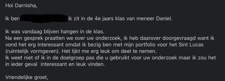 Ik denk dat het een goede zet was om de alternatieve methode van herrineringen ophalen in te zetten. Zo voelt het voor de deelnemer niet alsof het werk voor niets is gedaan. Als kunsteducator ben ik al dol enthausiast dat een jongere op vrijwillege basis deel neemt aan het onderzoek.
