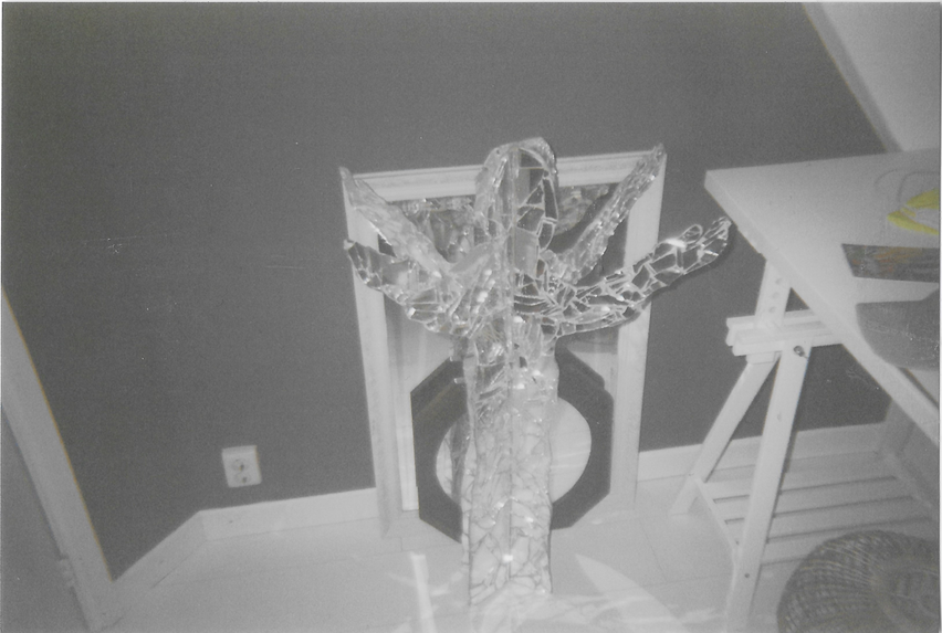 [00:23:55]: Silhouette gemaakt van mezelf met spiegels opgevuld en in de buitenwereld gezet. Wat reflecteert in de spiegels vormt onder andere mijn zelfbeeld.