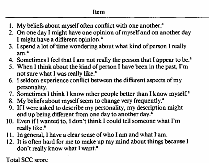 Ookal is dit niet de focus van dit onderzoek, SCC sloot wel erg aan op mijn onderzoek omdat dit een duidelijk gedefinieerd concept is met een methode om iemands ‘duidelijkheid van zelfbeeld’ te meten.