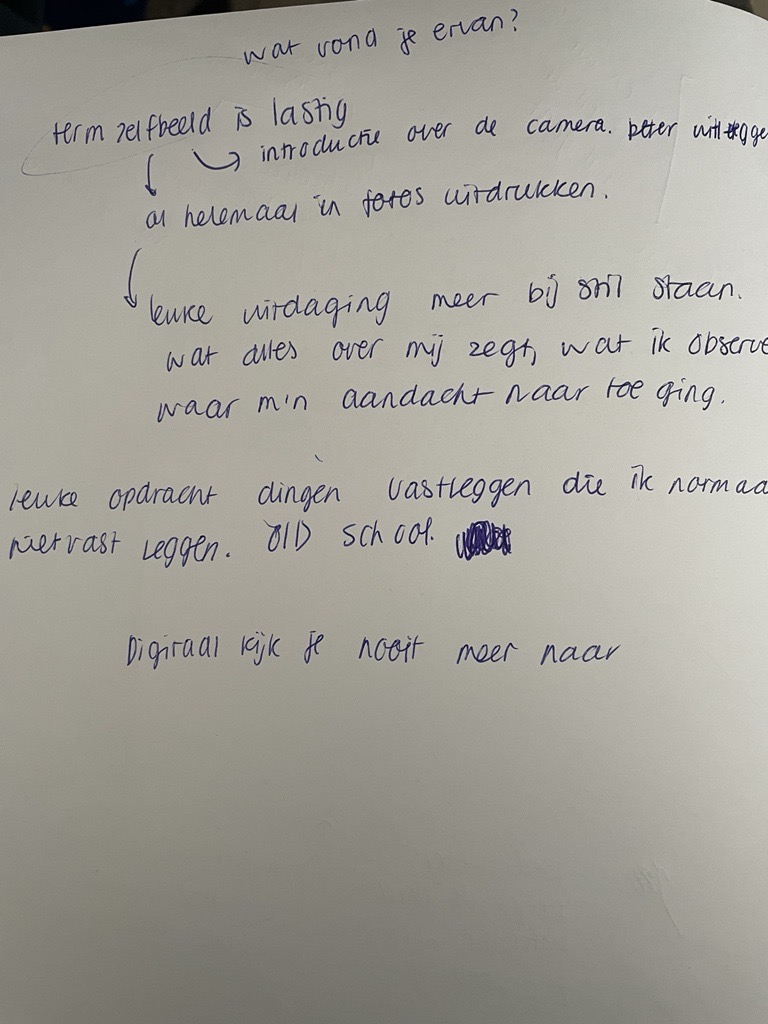 Hierna hebben we de opdracht besproken. Fotografeer 2 weken lang alles wat te maken heeft met jouw zelfbeeld en jouw zelfbeeld beïnvloed. Je mag alles fotograferen behalve jezelf. Hier was ze erg enthausiast over.
