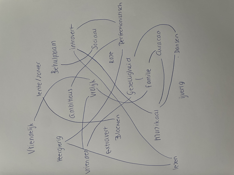 Om een verder beeld van Gaby te schetsen heb ik hier onder twee mindmaps toegevoegd die we samen hebben gemaakt aan het begin van het onderzoek. Zij heeft de 4 onderstaande zinnen afgemaakt die haar beschrijven. Op de tweede afbeelding hebben we woorden die haar omschrijven verbonden aan elkaar.