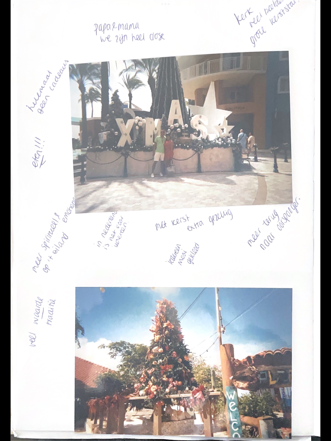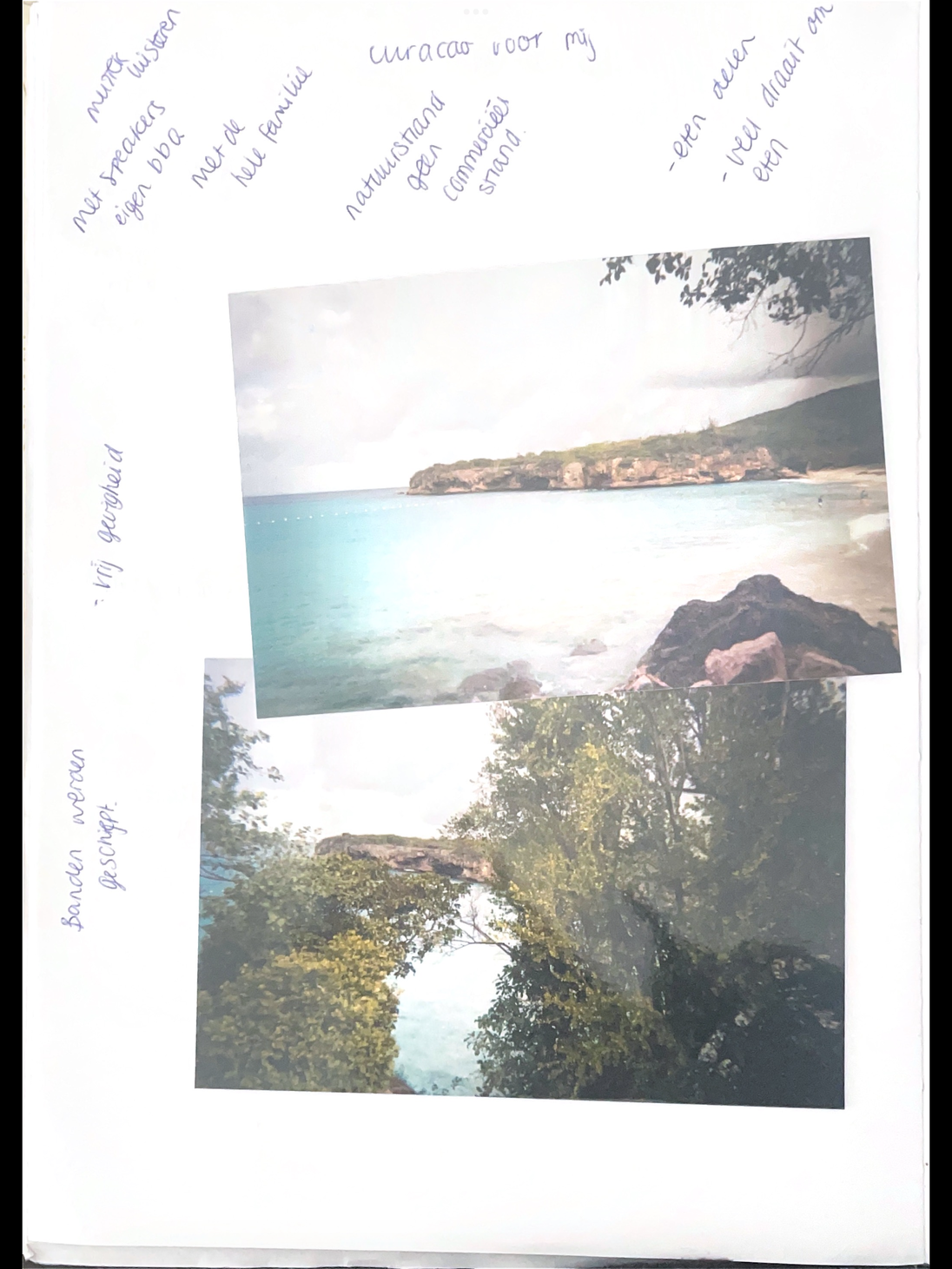 Tijdens de eerste analyse stond het beeldmateriaal van haar vakantie in curcacao centraal. Deze foto's zijn in de periode van kerst tot de tweede week van januari gemaakt en de analyse vond begin februari plaats. Het was niet alleen een zon en strandvakantie, maar ook een familie vakantie. Door deze opdracht die ze mee heeft gekregen was ze zich extra bewust van haar liefde voor het eiland, de impact die de Antilliaanse cultuur heeft op hoe ze naar haar zelf kijkt en de waarde die ze hecht aan familie relaties. Ze was bewuster bezig met de vraag waarom is het belangrijk voor mij? Wat hebben bepaalde situaties met mij te maken of op welke manier hebben deze situaties invloed op mij?