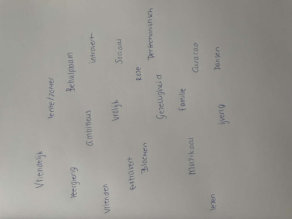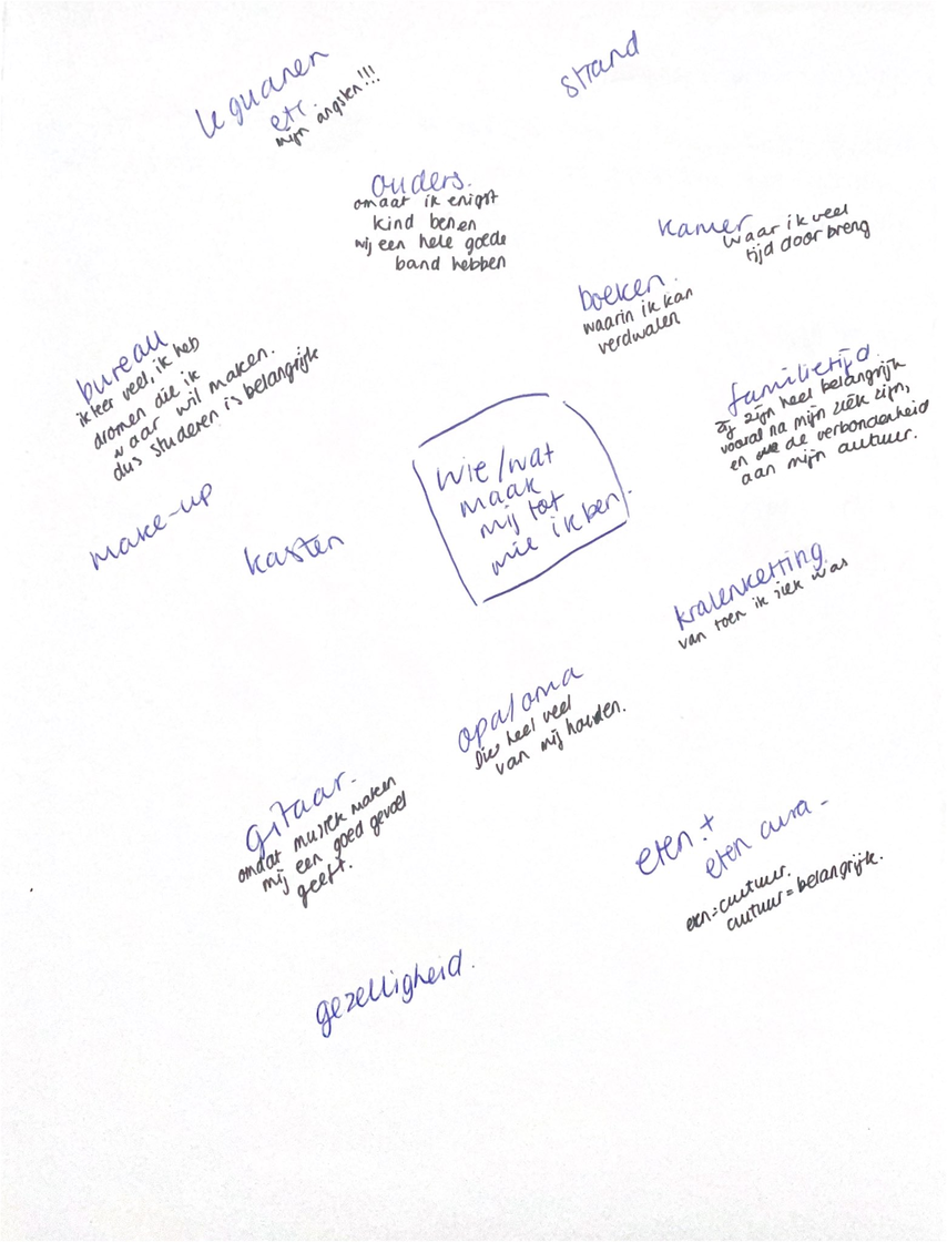 Een van de punten waar Gaby op kwam als feedback was dat ze het onderwerp abstract vind en daardoor heeft ze moeite met foto's maken. Ze legt voornamelijk dingen vast waar ze zich goed bij voelt of die ze leuk vind. Maar hierdoor is haar inspiratie voor de volgende fotografie ronde op. Het leek me daarom een goed plan om een korte opdracht samen te doen waarbij we zijn gaan brainstormen. De vraag die ik heb gesteld is: ''Wie of wat maakt mij tot wie ik ben''. Hiernaast zie je de uitkomst van de