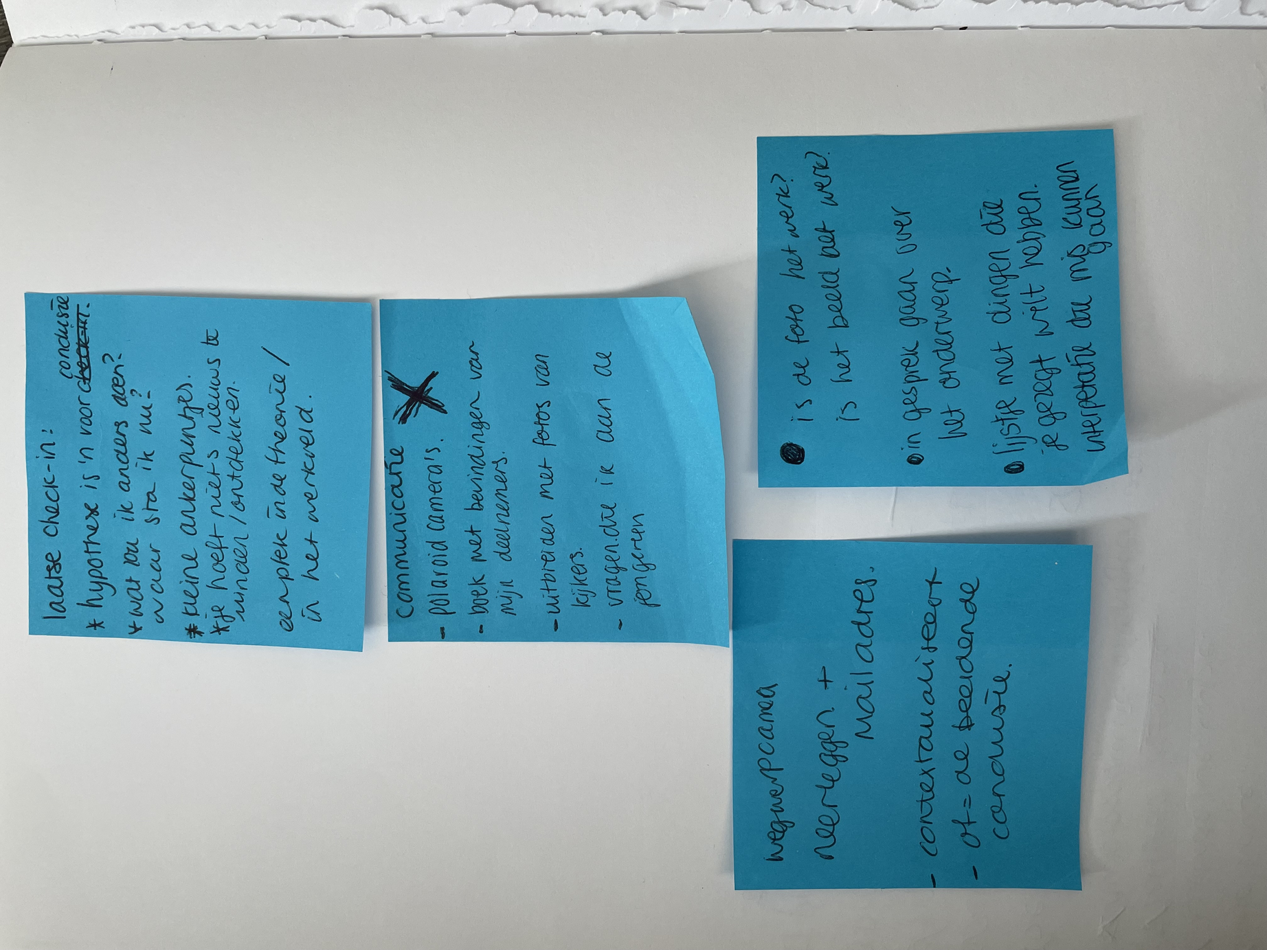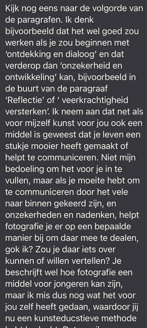 Daarnaast heb ik het met Maurice kort gehad over het gedeelde eigenaarschap van mijn onderzoek. Ik zie mijn participanten als medeonderzoekers. We hebben het gehad tot hoe ver ik mijn participanten mee kan nemen in het onderzoek. Op dit moment maken zij foto’s die mij meenemen in hun leefwereld. Ze nemen deel aan de interviews en we zijn samen in gesprek over het zelfbeeld en wat de opdracht voor ze betekent. Maar kan ik ze ook mee nemen in de theoretische verkenning? Is het een idee om de participanten iets vaker te zien en naast het fotograferen en interviews ook te vragen of ze mee de theorie in willen duiken? Hiervoor is het een mogelijkheid om ze een stukje behapbare theorie toe te sturen waar ze zelf op kunnen reflecteren. Hierna kunnen we in gesprek gaan over de theorie, wat denken ze hierover, hoe interpreteren ze de theorie? Hier wil ik nog goed over denken omdat ik nog niet weet met welk doel ik dit dan zou doen. Doe ik dit omdat gedeelt eigenaarschap een belangrijk onderwerp is binnen mijn praktijk, of doe ik dit omdat het ook daadwerkelijk bijdraagt aan mijn onderzoeksvraag?
