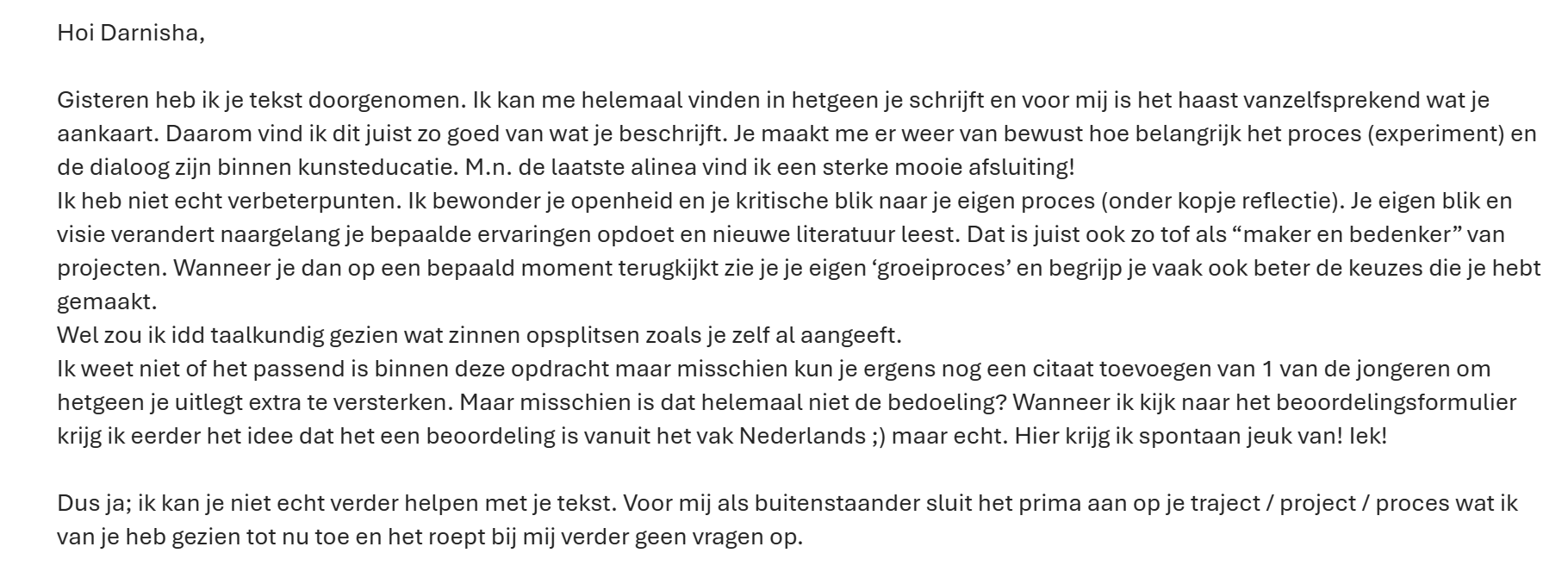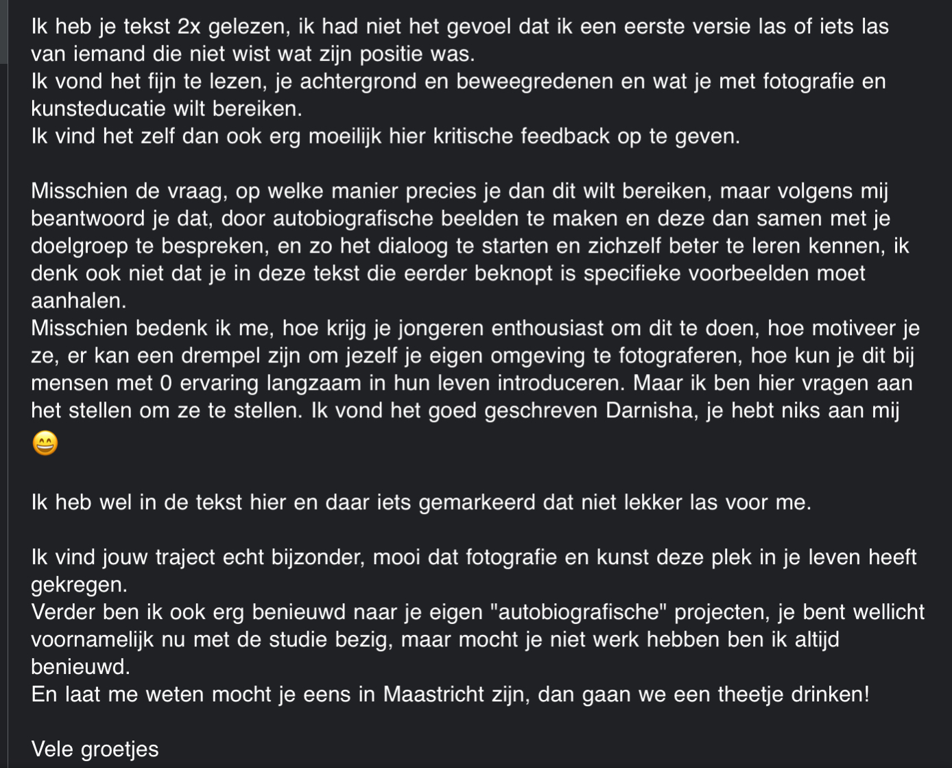 Voor mijn positionering had ik veel nood aan kritische feedback. Ik heb de feedback momenten van de docenten gemist omdat ik geen positionering op papier kreeg. Toen ik eenmaal wat op papier had gezet heb ik deze met een aantal mensen gedeeld. Dit zijn mede-studenten, oud-docenten, mijn kritische partner Cathalijne van Broekhoven, mijn partner, een kritische collega. Ook is het door een nederlands docent nagekeken op taal- en grammatica aangezien dit niet mijn sterktste punt is. Hiernaast wil ik de feedback delen.