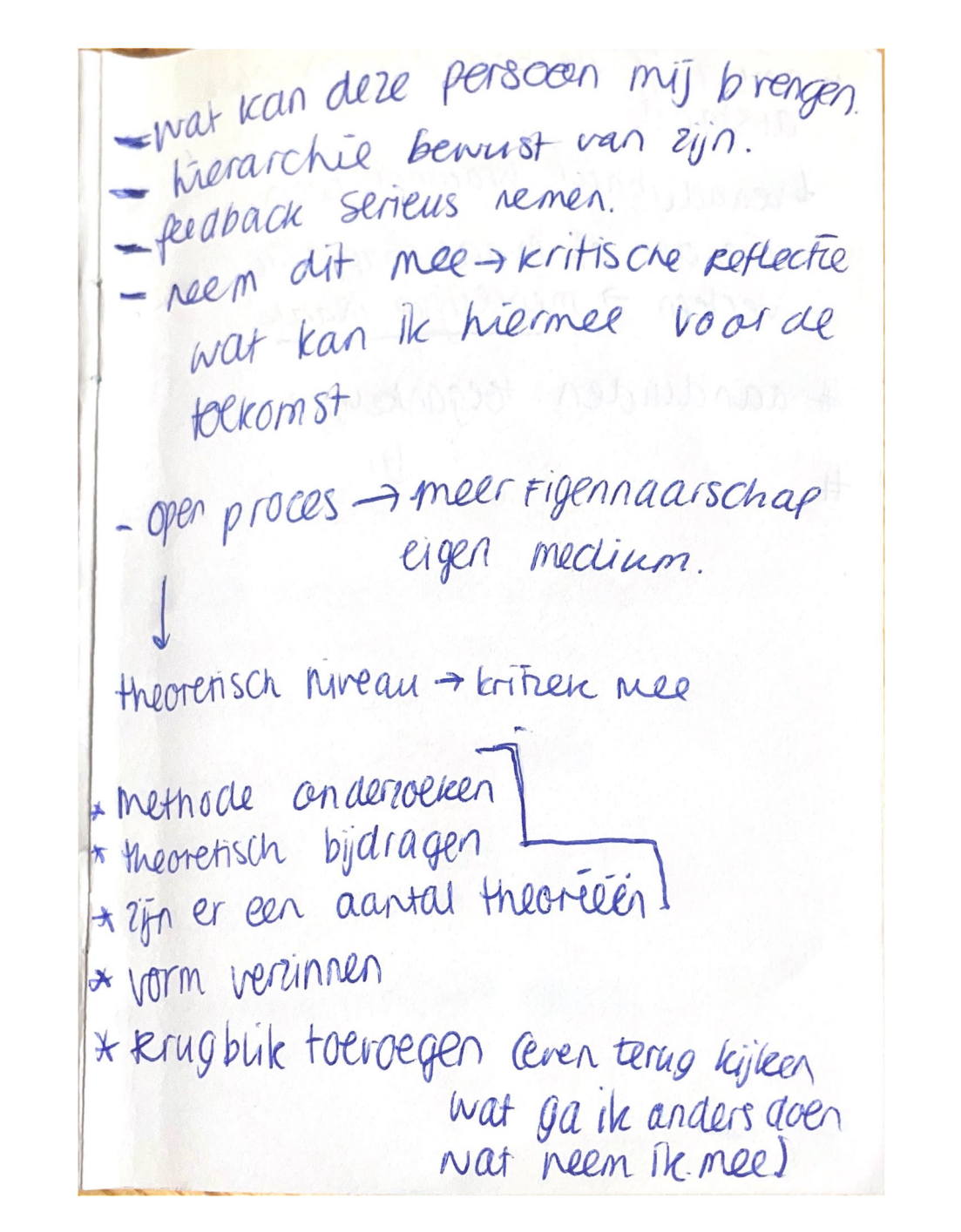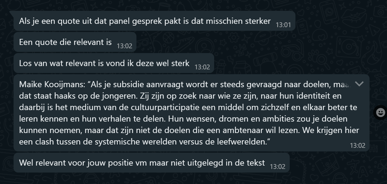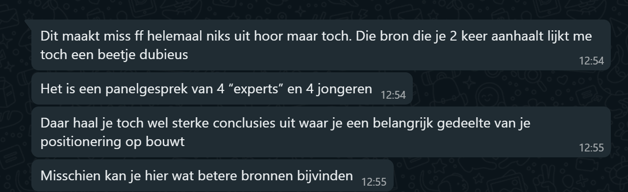 Gesprekken voeren met exteren om je blik te verruimen, om een kritische reflectie te ontvangen. De gesprekken die ik met exteren heb gevoerd zijn waardevol geweest om mij te wijzen op mijn aannames en onderbouwingen. Daarnaast is het ook erg fijn geweest om te kunnen praten met mensen die meer ervaring hebben in gesprekken voeren met jongeren, tips hebben voor vertrouwensbanden opbouwen of gewoon te praten over mijn twijfels en gevoelens.