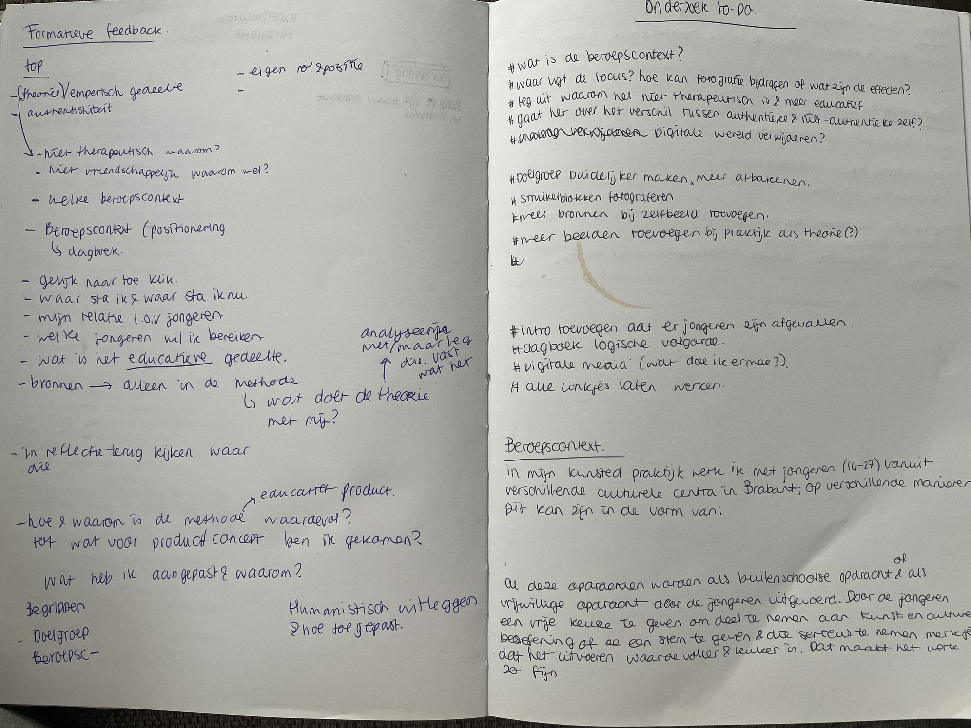 Op 26 april had ik een spannende dag, het was tijd voor de formatieve beoordeling. Ik merkte dat mijn onzekerheid weer toesloeg en ik ineens weinig vertrouwen had. Fijn om te horen dat ik toch niet zo slecht bezig was en dat wist ik ook wel. Jammer dat die onzekerheid de overhand neemt. In de afbeelding hiernaast zie je een overview van de feedback die ik heb ontvangen en wat ik ervan wil toevoegen in het onderzoek. Het komt erop neer dat ik mijn focus de laatste weken vooral op het theoretische gedeelte wil leggen. De theorie kan namelijk sterker aan het praktijk onderzoek gekoppeld worden. De uitspraak van de dag was: ''Behandel je theorie met net zoveel liefde als je praktijk''. Dat is dus echt iets wat ik wil proberen. De theorie omarmen en als net zo waardevolle data zien als mijn praktijk onderzoek.