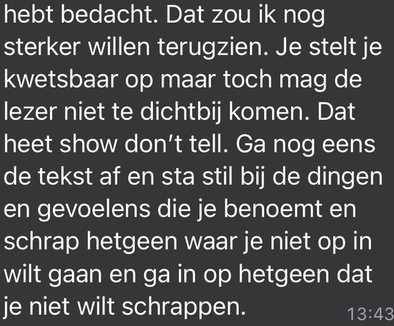 Tijdens de lunch heb ik goed met mede studenten kunnen sparren over het proces waar we nu doorheen gaan. Die laatste loodjes zijn super zwaar. Ik vind het lastig om de balans te houden. Deze laatste fase breekt mij best af, de onzekerheid neemt toe. Hierdoor vind ik het moeilijk om afstand te nemen en wil ik door blijven gaan. Maar op dit moment in het onderzoek is er weinig ruimte om nog heel veel extra onderzoek te doen. Het is ook belangrijk om te blijven onthouden dat het een registratie/logboek is. Ik hoef en kan geen perfect onderzoek doen (wel zo perfect mogelijk hopelijk). Het was in iedergeval erg fijn om samen onze ervaringen te delen, zo weet je dat je niet alleen bent. Dit was het fijnste moment van deze dag, die voor mij best zwaar was.