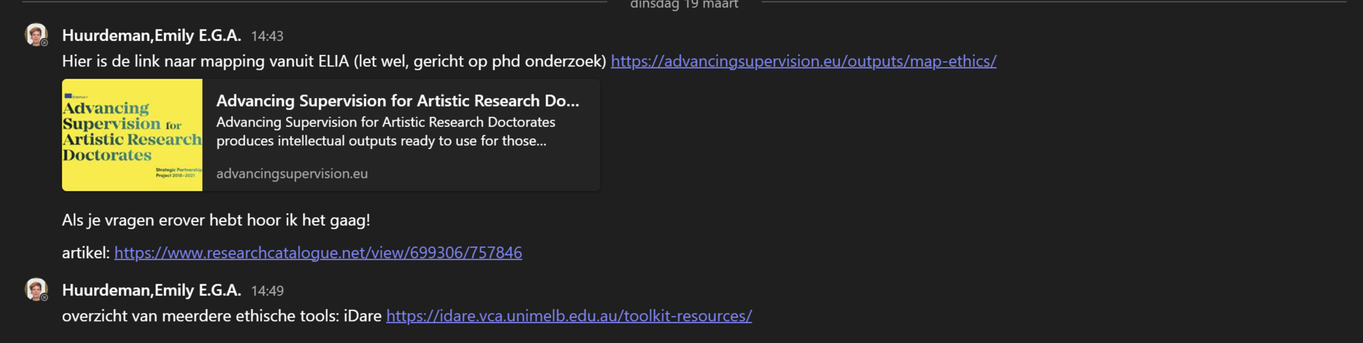 In een van mijn laatste gesprekken met Emily heb ik mijn zorgen kunnen uiten over de impact van mijn praktijk onderzoek op de deelnemers. Ik was vrij emotioneel omdat ik het belangrijk vind om de jongeren niet te schaden, ze oncomfortabel te laten voelen of iets wat negatief is. Ik ben hier heel voorzichtig in maar kan ook enorm kritisch zijn naar mezelf. Tijdens dit gesprek heb ik vooral kunnen ventileren, dat is iets wat ook nodig is. De uitkomst van dit gesprek was dat ik mij meer op ethiek kon focussen. Emily heeft mij meerdere links gestuurd om de ethics van het onderzoek te toetsen. Dit is niet alleen goed voor mijn eigen gemoedstoestand maar ook het versterkt mijn onderzoek alleen maar meer. Dit onderzoek is niet alleen een onderzoek naar het zelfbeeld van een ander, maar ook naar die van mezelf. Als ik een ding heb geleerd is het dat ethische keuzes maken een van dé belangrijkste dingen is voor mij, waarom dat zo is wil ik graag nog een keer verder onderzoeken. Ik ga dus zeker aan de slag met de tools die ik heb gekregen van Emily. Om te kijken waar mijn eventuele 'blind spots' zitten en waar ik dus in het vervolg meer rekening mee kan houden.