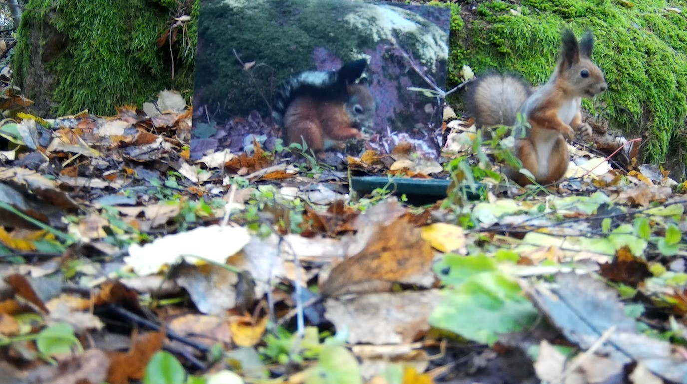 Katoin peilien ja muotokuvien eteen vettä ja ruokaa, jotta eläimet tulisivat paikalle. Liha oli kissanruokaa, jota äitini joskus heittää pihalle variksille, jos kissat nirsoilevat. Äitini ruokkii lintuja ja oravia läpi talven, joten teosprosessia varten tarjolle laitettu ruoka ei paljoa poikennut normaalista. Äitini huolehti veden vaihdosta ja ruuan lisäämisestä sekä astioiden pesusta. Pohdin kuitenkin mahdollista ongelmaa ruuan jättämisessä eläimille suuremmissa määrin kuin normaalisi niille olisi tarjolla. Onko tekoni tarpeeksi perusteltua taiteellisen tutkimuksen nimissä? Voisiko siitä koitua eläimille jotain harmia? Olin jo vuonna 2016 pohtinut kaupunkieläimiä teoksessani City Animals ja tuon työn lomassa katoin tietyille valikoiduille villieläimille juhlaillallisen. Tästä sain synninpäästön biologi, ympäristötutkija ja tietokirjailija Timo Vuorisalolta, joka totesi, ettei tuosta olisi haittaa ja hän oli tyytyväinen, että kaupunkieläinasiaa käsiteltäisiin. Nyt teosprosessi vain kesti kauemmin, kuvasin eläimiä monta viikkoa, joten päädyin siihen, että kissanruokaa laitetaan vain lyhyen hetken ajan uuteen ympäristöön metsään. Päättämäni aika lyheni entisestään, kun näin miten supikoira otti kiinni näädän hännästä ja vetäisi sen alas puusta. Oletan, että tarjolla ollut ruoka oli vähintäänkin osa syy tälle tapaukselle. Näätä ei kuitenkaan onneksi pahemmin tästä pelästynyt, vaan palasi paikalle saman tien. En halunnut aiheuttaa kilpailua ruuasta eläinten välillä, vaikka sitä oletettavasti tapahtuu myös ilman minun laittamaani ruokaa. Siemenet ja pähkinät olivat näin ollen pääasiallinen ruoka, joita äitini tarjoaa metsikössä joka tapauksessa.