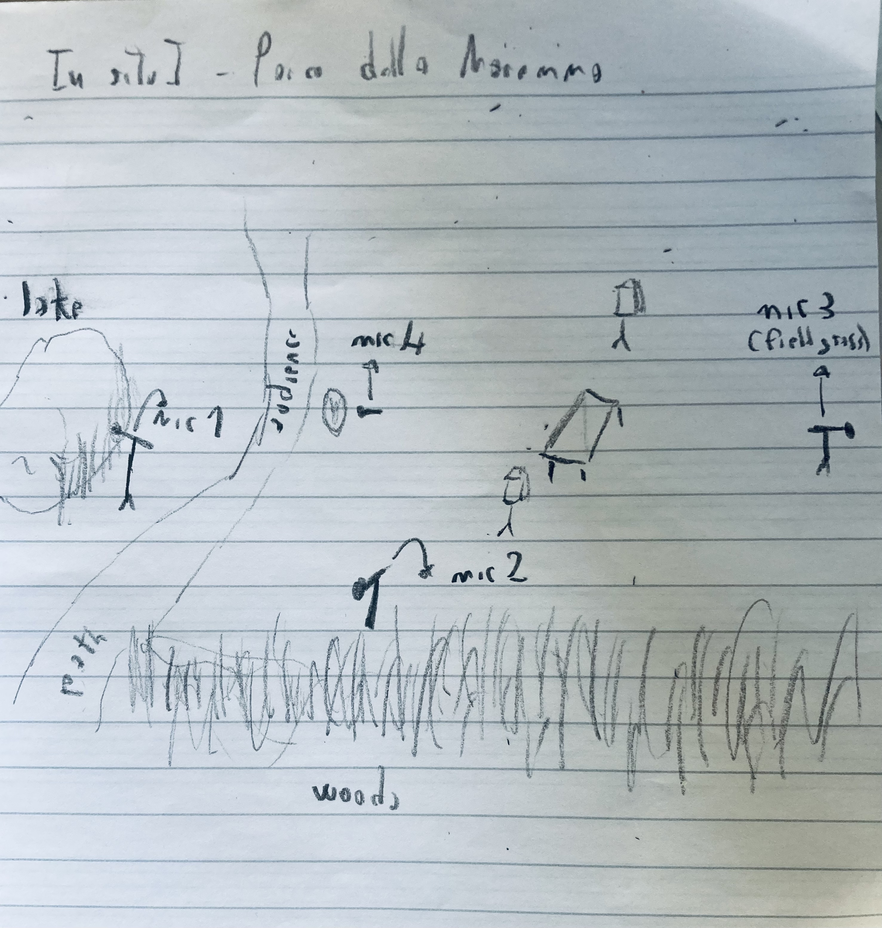 With four panoramic microphones available, I decided to mic four points that I considered sonically interesting (photo 4-5): mic 1 at the lake, mic 2 in the forest to the right, which housed the nests of some birds and cicadas, mic 3 in the field grass, particularly in spots where I knew an actor would move, and mic 4 on the path where the audience would stop, near a basket where the actors and I had placed some objects, mostly materials found on site (pinecones, abandoned bottles).
