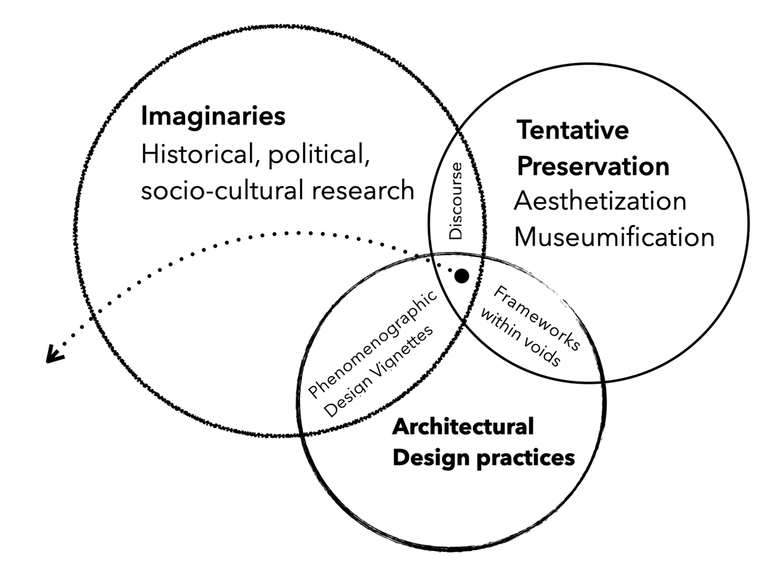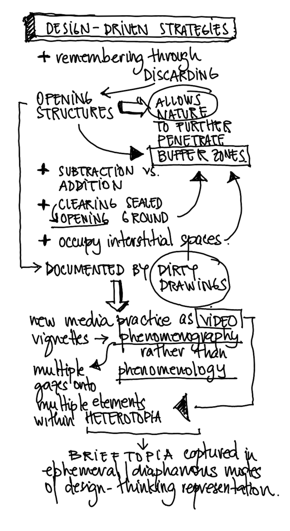 ‘Live-action’ drawings of design strategies enabled communication in transdisciplinary environments and illustrated modes of preservation that expanded beyond scholarly discourse and architectural products. The drawings open up the potential of the spaces beyond financial commodification, where "there are no obvious spectacles around which to organise a tour, or which fit into expectations about what will be gazed upon, and sights will often be indecipherable." (Edensor, 2010)