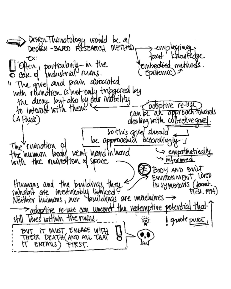 Applying these insights to designing within ruin-bodies leads to the emergence of parallels to the field of thanatology, as adaptive reuse design situates itself between the aforementioned building natalism and the veneration of already dead objects.