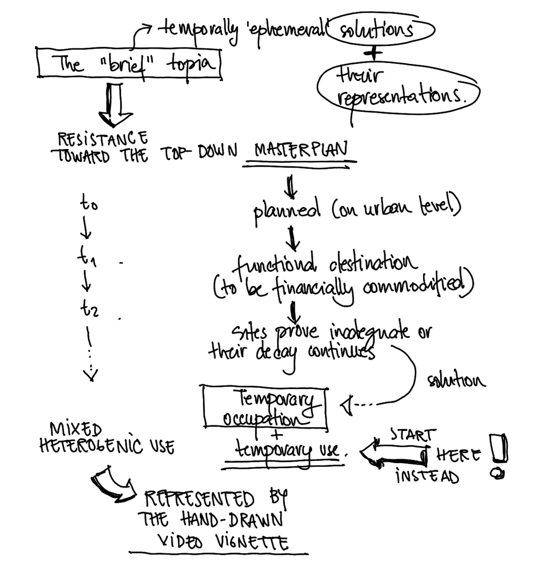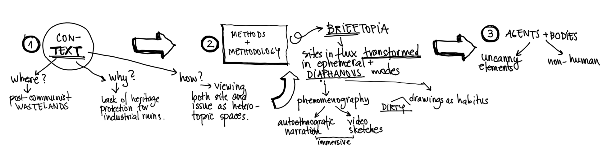 The central theme of this exposition is to illustrate how the ur-tool of designers, the hand drawing, can be used to forge design methodologies for design briefs within heterotopic spaces such as industrial ruins.