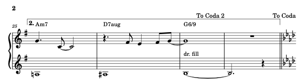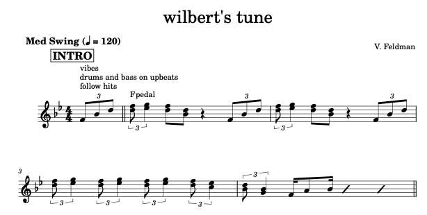 First of all, analyzing again the theme, we can see how Vic blends the vibraphone with the rhythm section, leaving the melodic part to the horn instruments and literally using the vibes as an accompanying and rhythmic instrument. This is happening both in the INTRO and in the A section (0:00-0:41).
